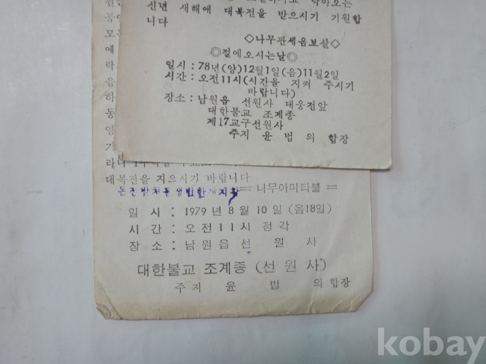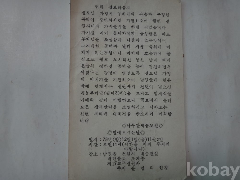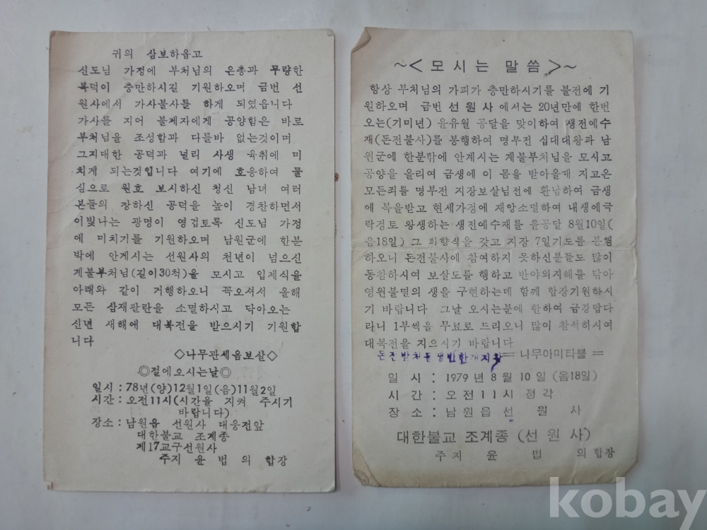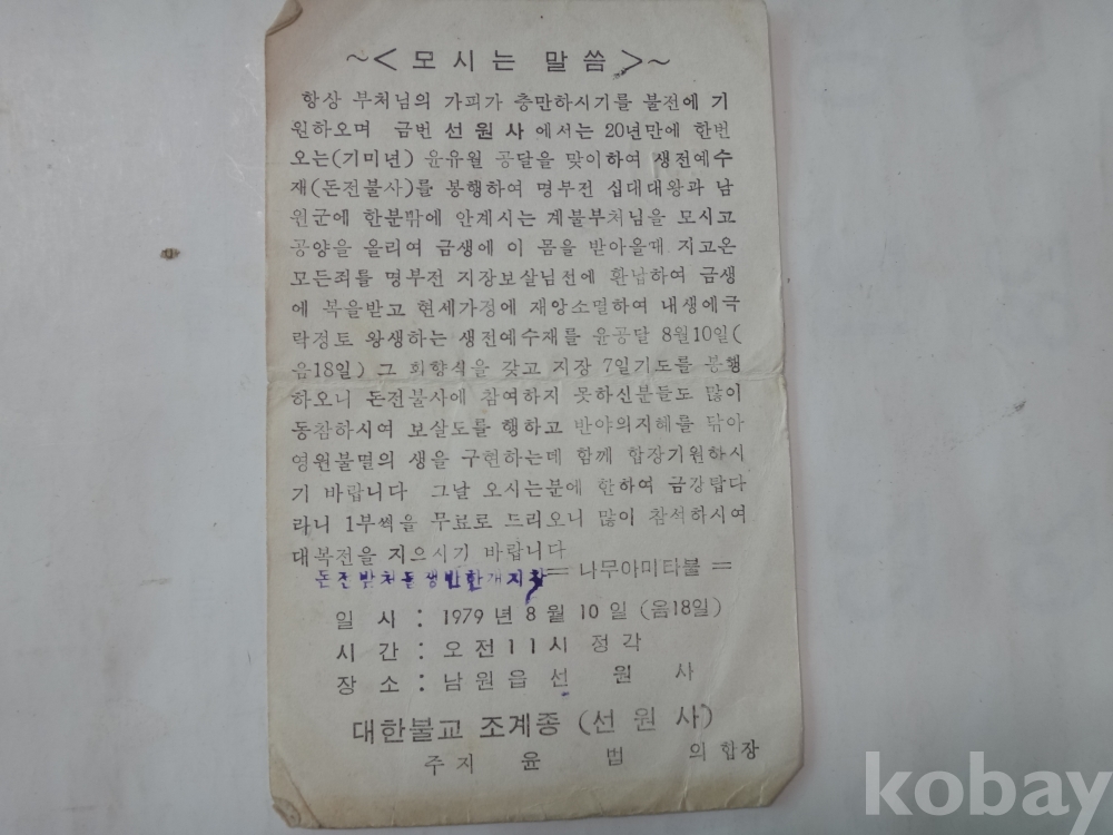 남원읍 선원사 - 계불부천님 입제식 거행, 생전예수재 (돈전불사) 봉행 안내 (1979년)