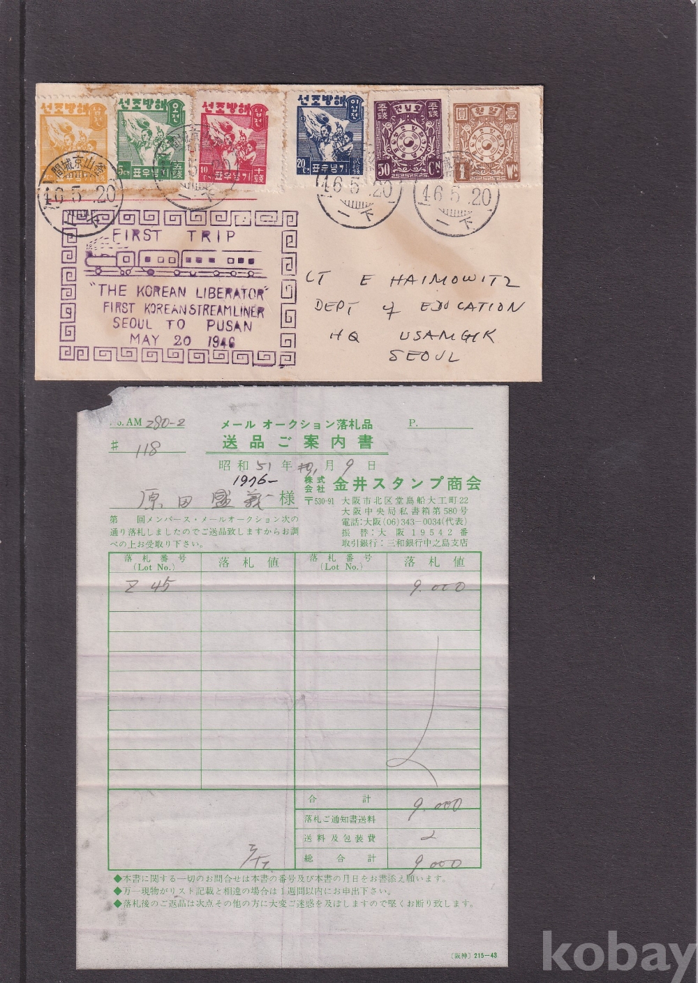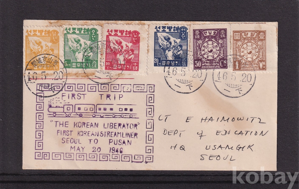- 해방조선 6종 첩부 해방자호 열차 운행기념 까세 : 釜山京城間 46.5.20 下一