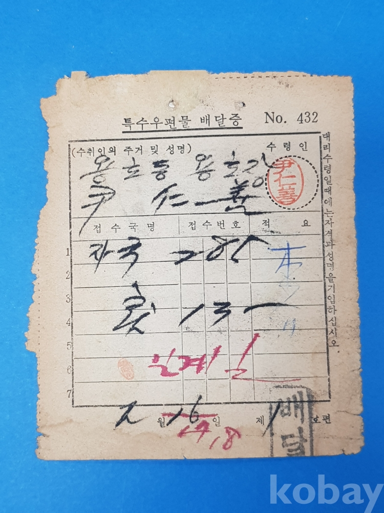 [p4] 특수우편물 배달증/우표 3매첩부