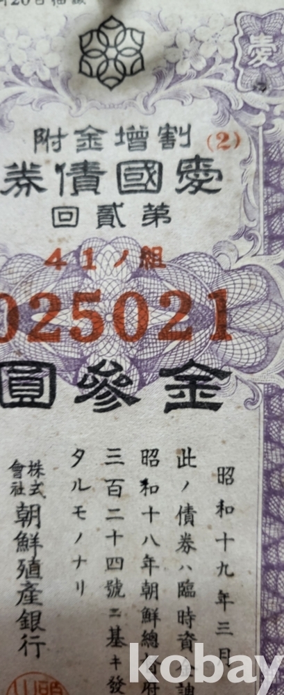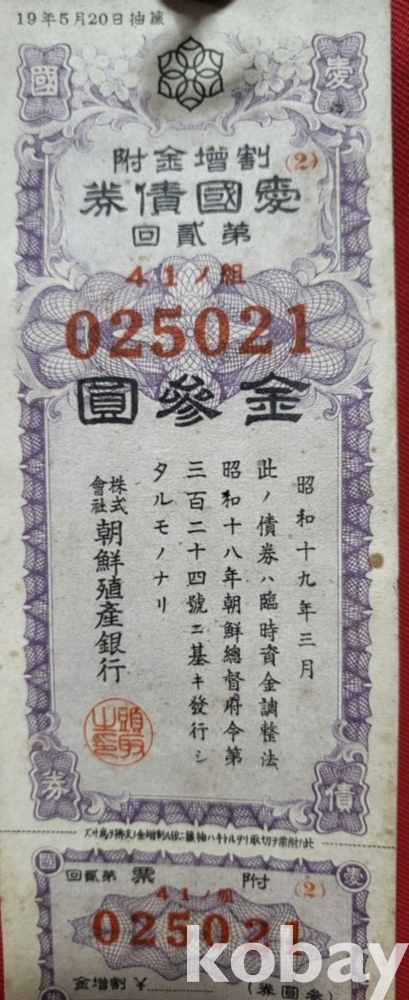 주식회사 조선 직산은행 소하19년(1943년) 발행된 할증금부(割增金附)입니다,