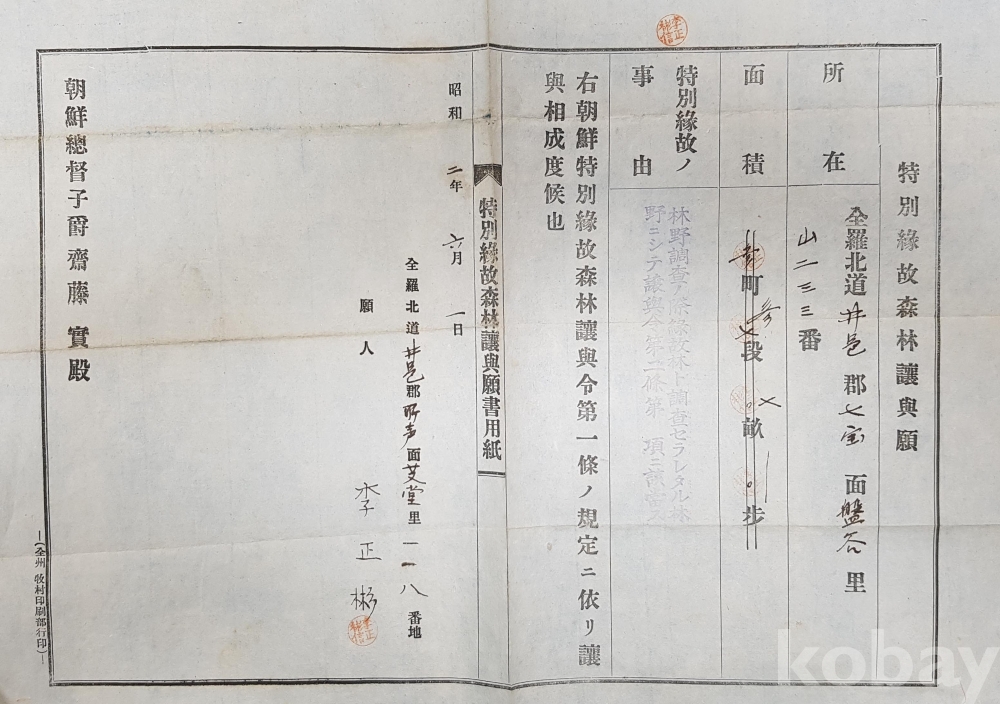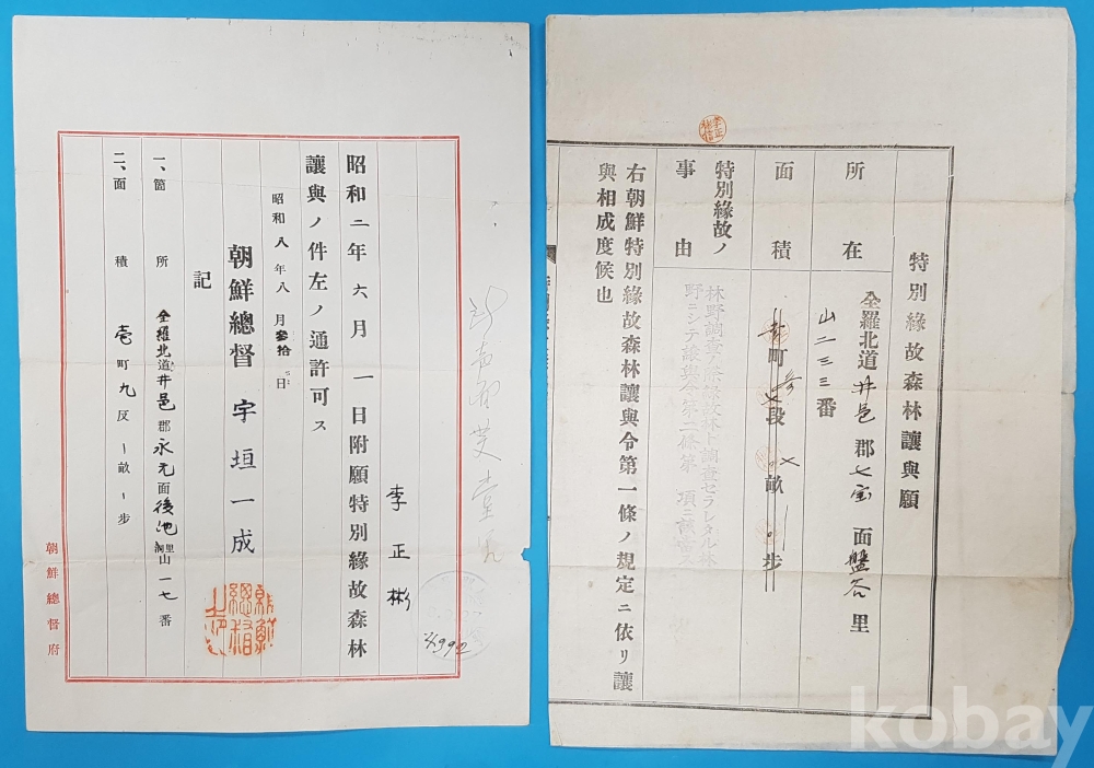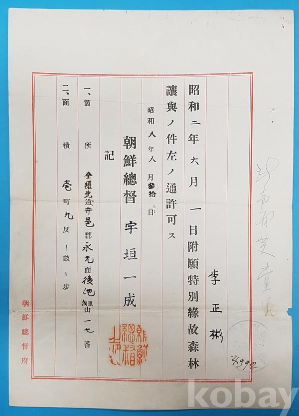 1927년 井邑郡 特別緣故森林讓與 讓與願 및 許可書 조선총독의 이름과 직인이 날인됨