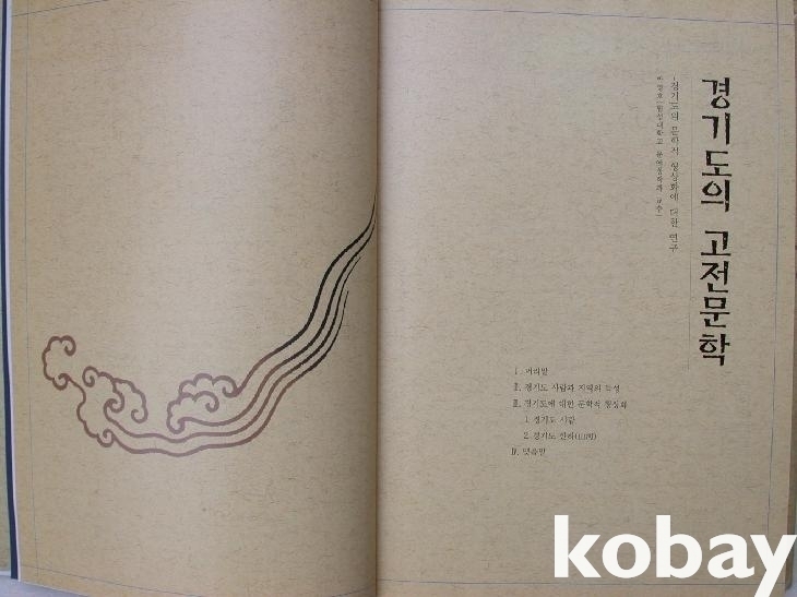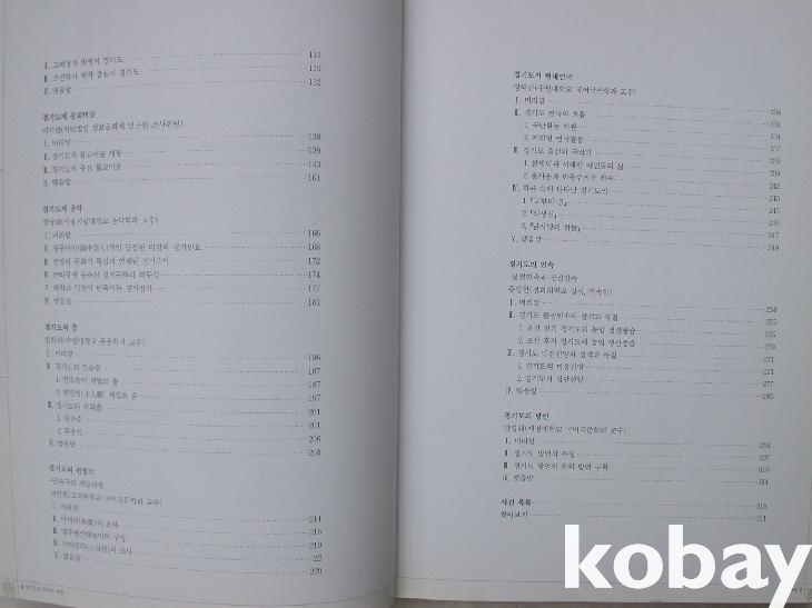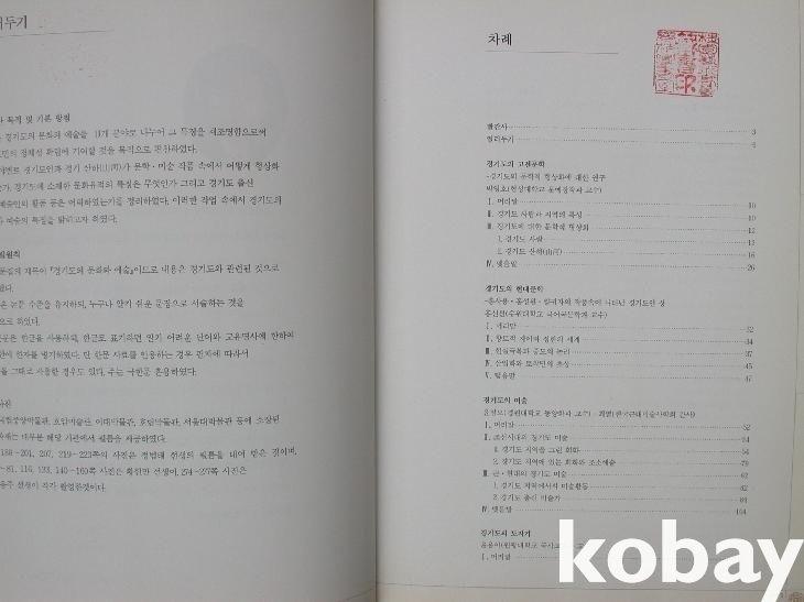 "경기도의 문학 미술 음악 무용 연극 민속 등 문화와 예술 전반을 11개 분야로 나누어 연구"한 결과라는 발간사가 있다. 각각의 주제별로 각 대학의 유명 전공자가 담당하여 집필하였고 끝에 편찬위원회 소개가 있다. 이전 소장처의 흔적이 남아 있다.