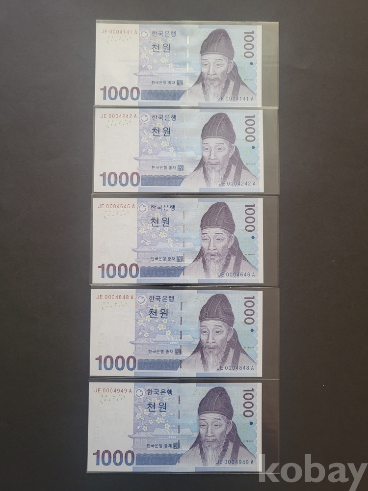 [근대사 화폐 기획전] 한국은행권 3차천원 특이번호 5매 일괄