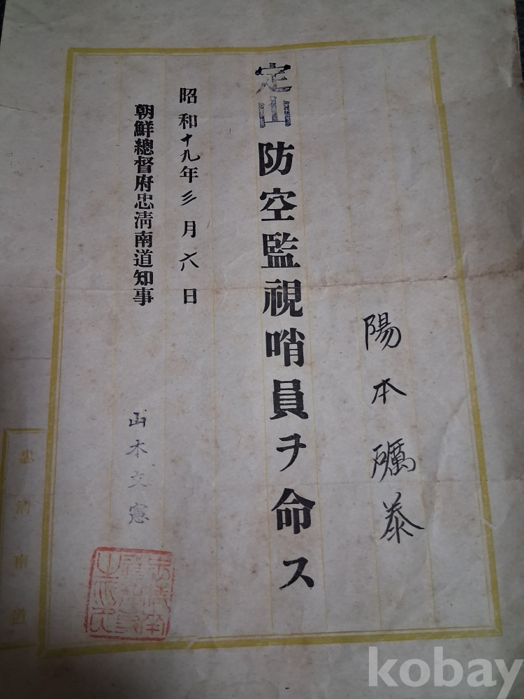 1944년3월6일에 발행된 방범감시초소 임명 문서 입니다
