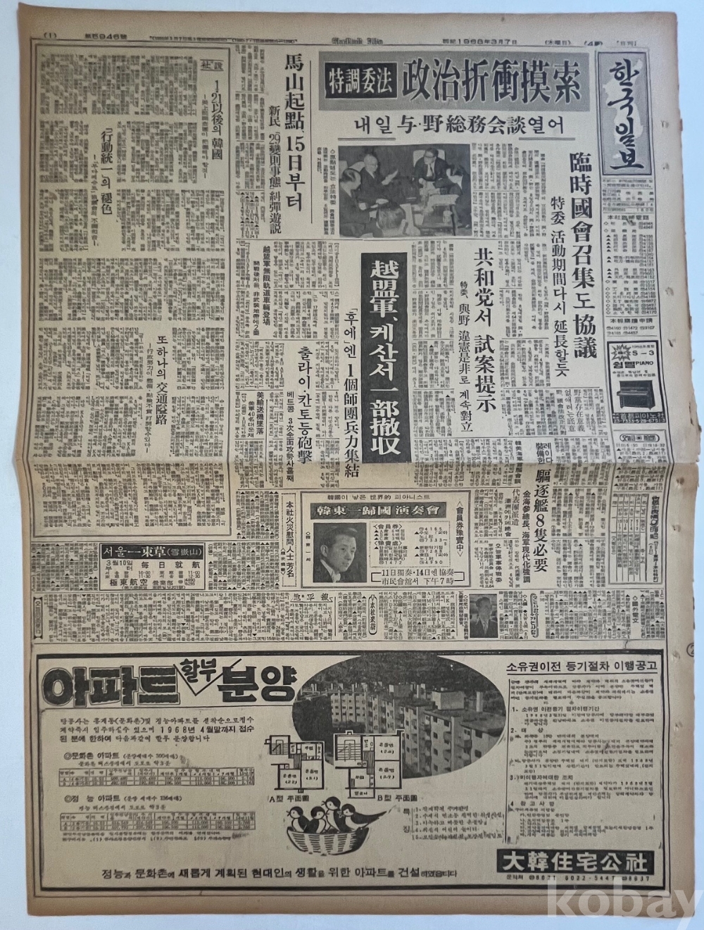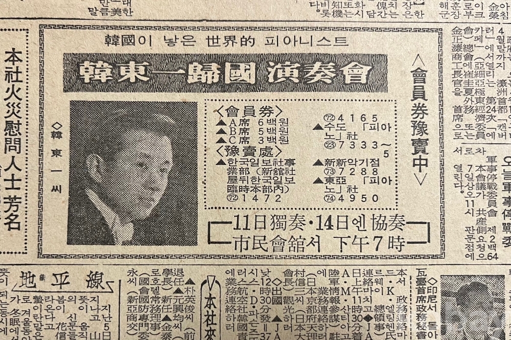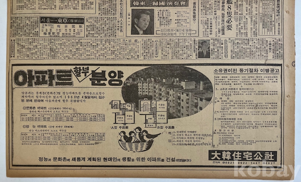 한동일 피아니스트의 귀국연주회 광고와 문화촌 아파트, 정능아파트 분양광고가 실린 1968년 한국일보 낱장입니다.
