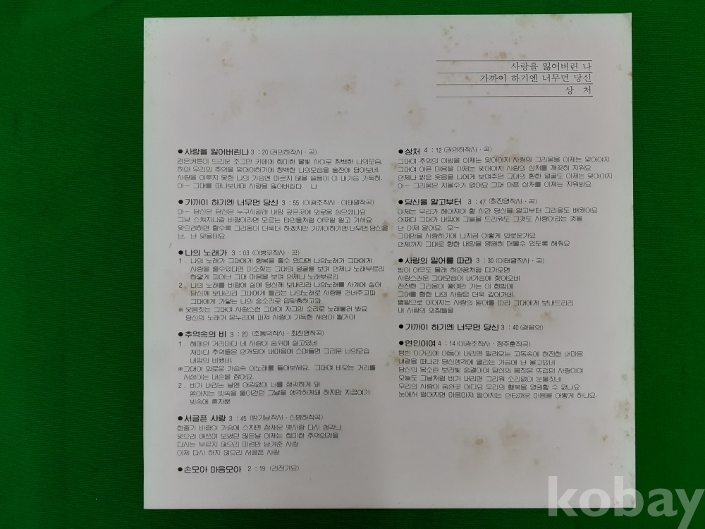 | 자켓상태 | EX : 약간의 마모, 모서리 찢김 존재 | 음반상태 | EX : 재생에 영향 없는 가벼운 기스 존재 | 발매정보 | 알수없음 | 가사지여부 | 유 |