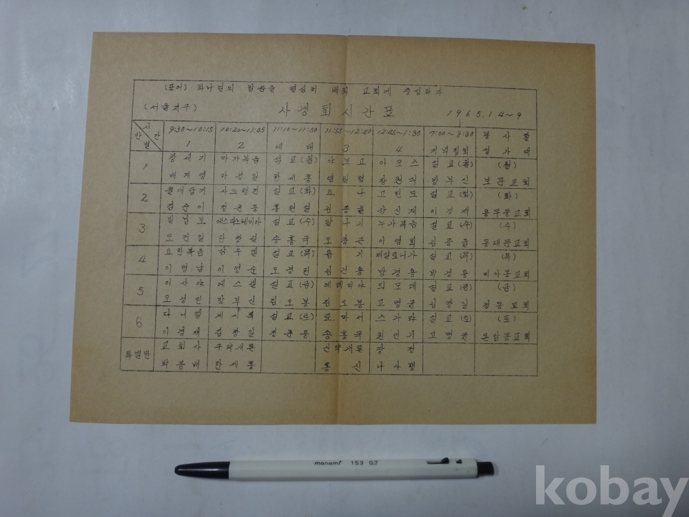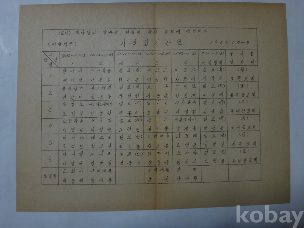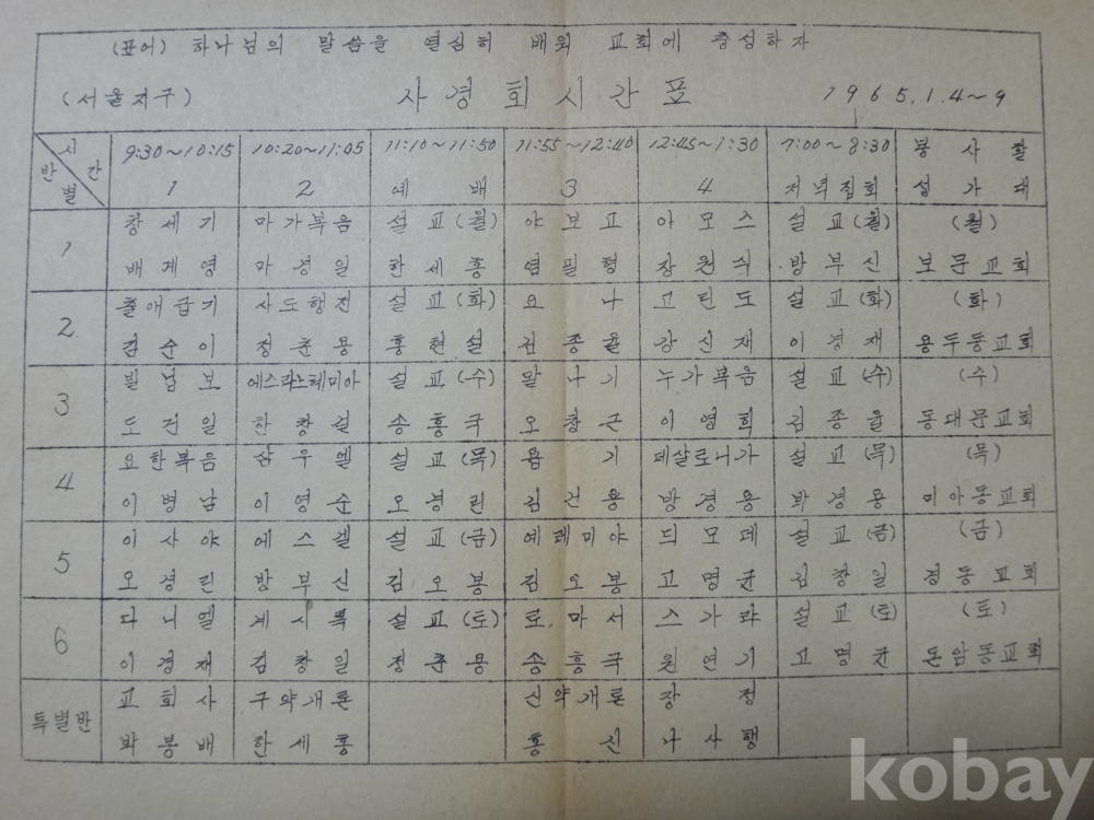 사경회 시간표 - 하나님의 말씀을 열심히 배워 교회에 충성하자 (1965년)