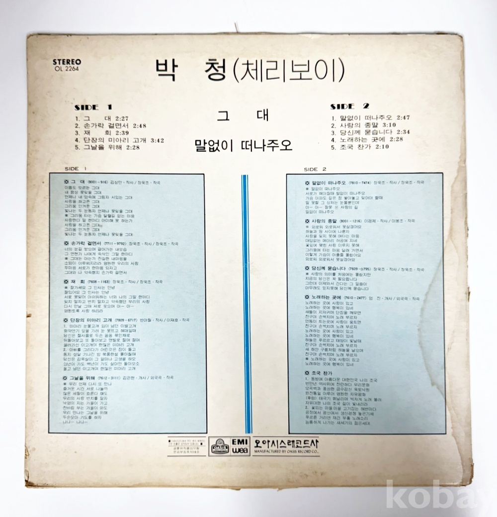 | 자켓상태 | EX : 약간의 마모, 모서리 찢김 존재 | 음반상태 | EX : 재생에 영향 없는 가벼운 기스 존재 | 발매정보 | 초반 | 가사지여부 | 무 |