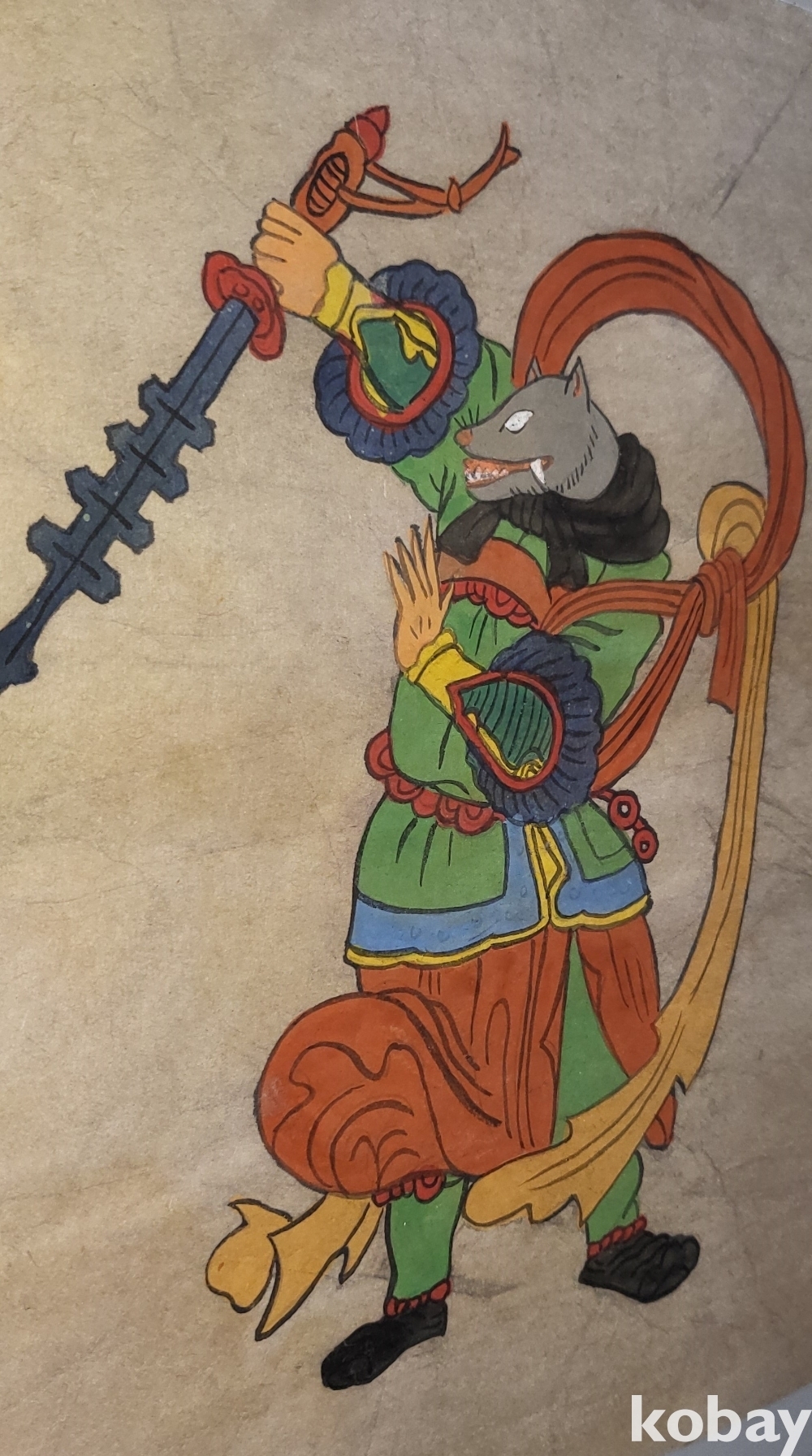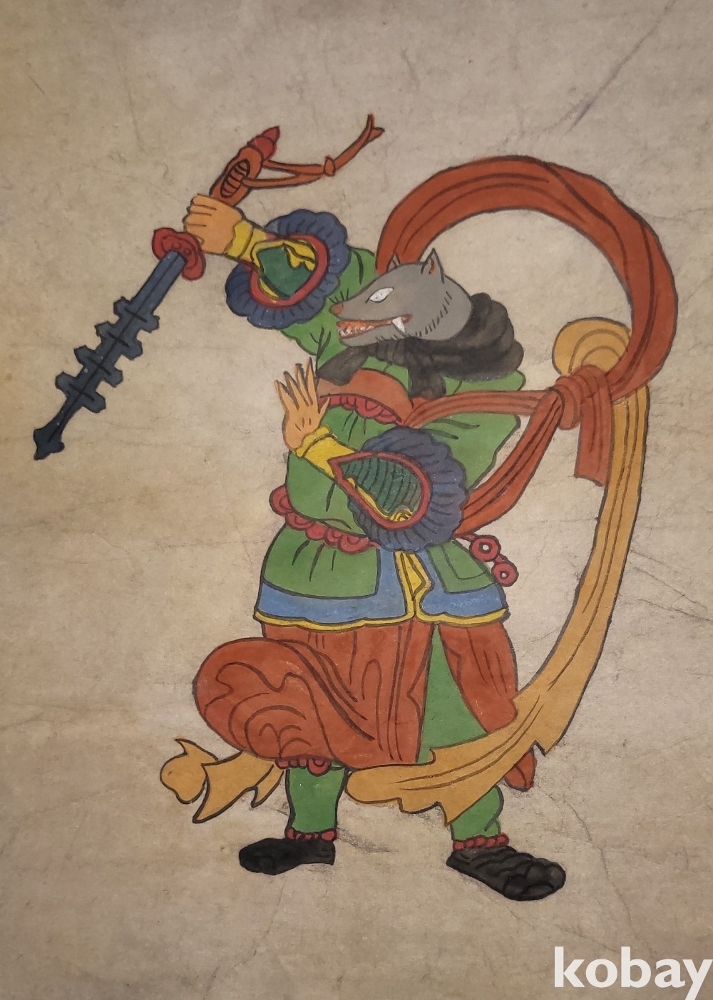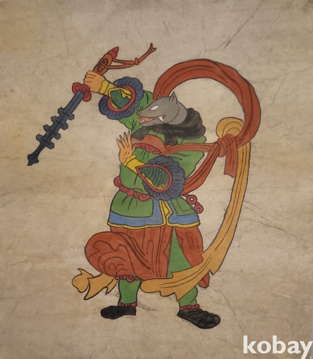 구한말 연대 갖춘 장지 바닥에 당채로 그려진 동물 형상 그림입니다,