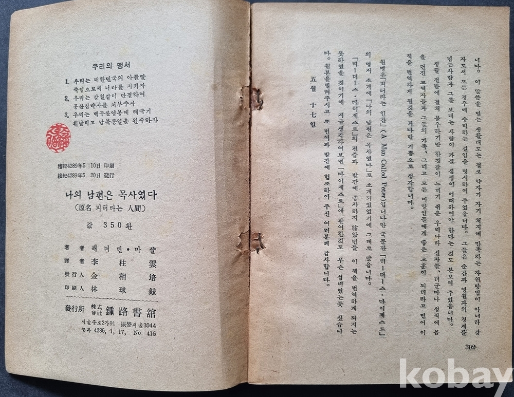 ee-55 / 1956년 기독교 서적 "나의 남편은 목사였다" 이주운 역