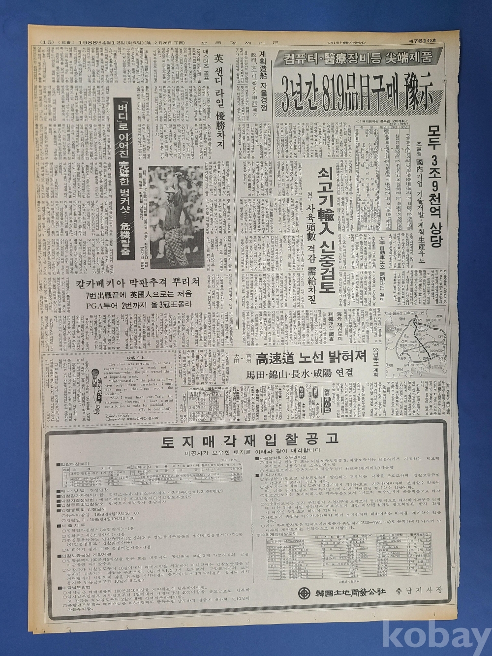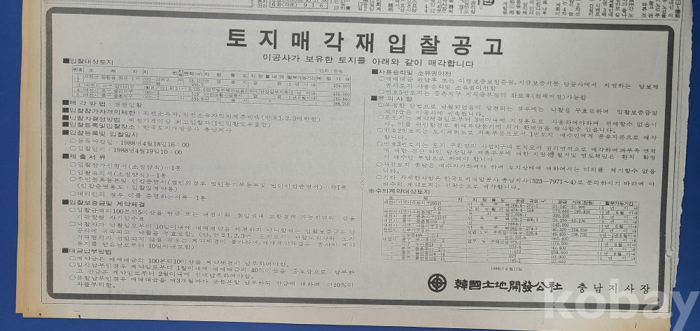 1988년 토지매각재입찰공고 (한국토지개발공사 충남지사장) 대전시,서천군 토지 매각