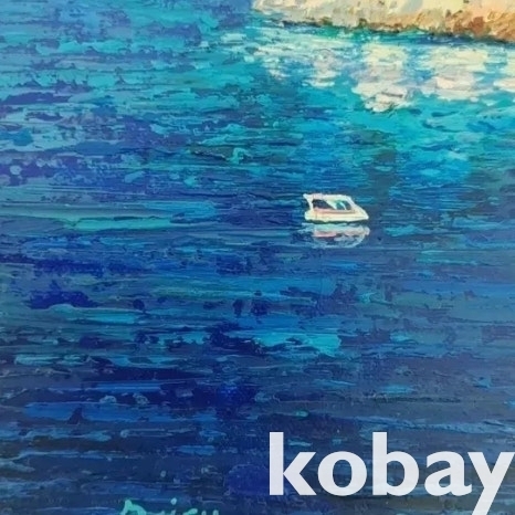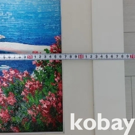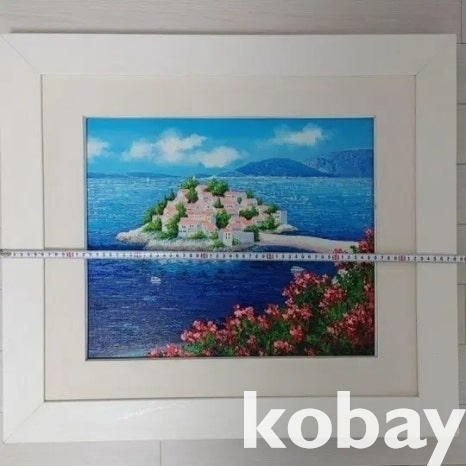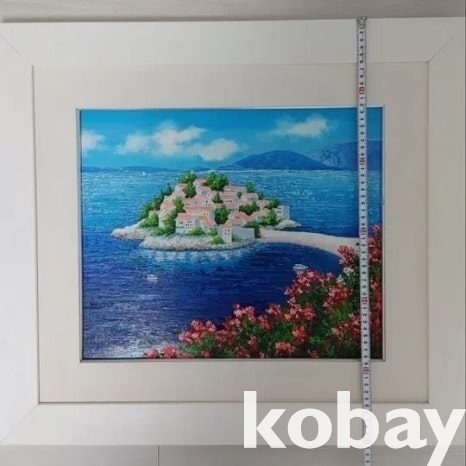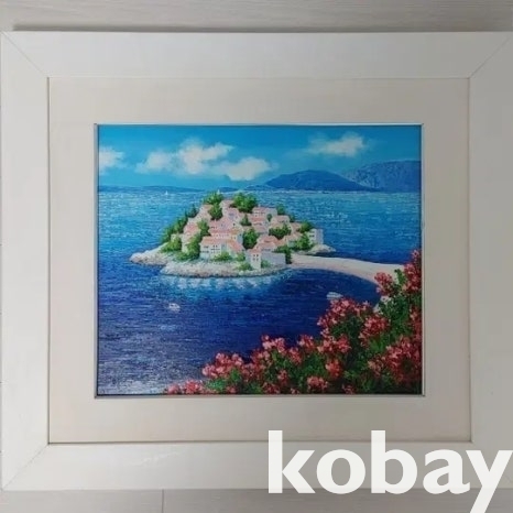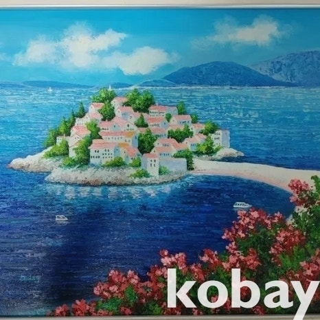 꽃과 섬 마을을 아름답게 표현한 유화 액자입니다.