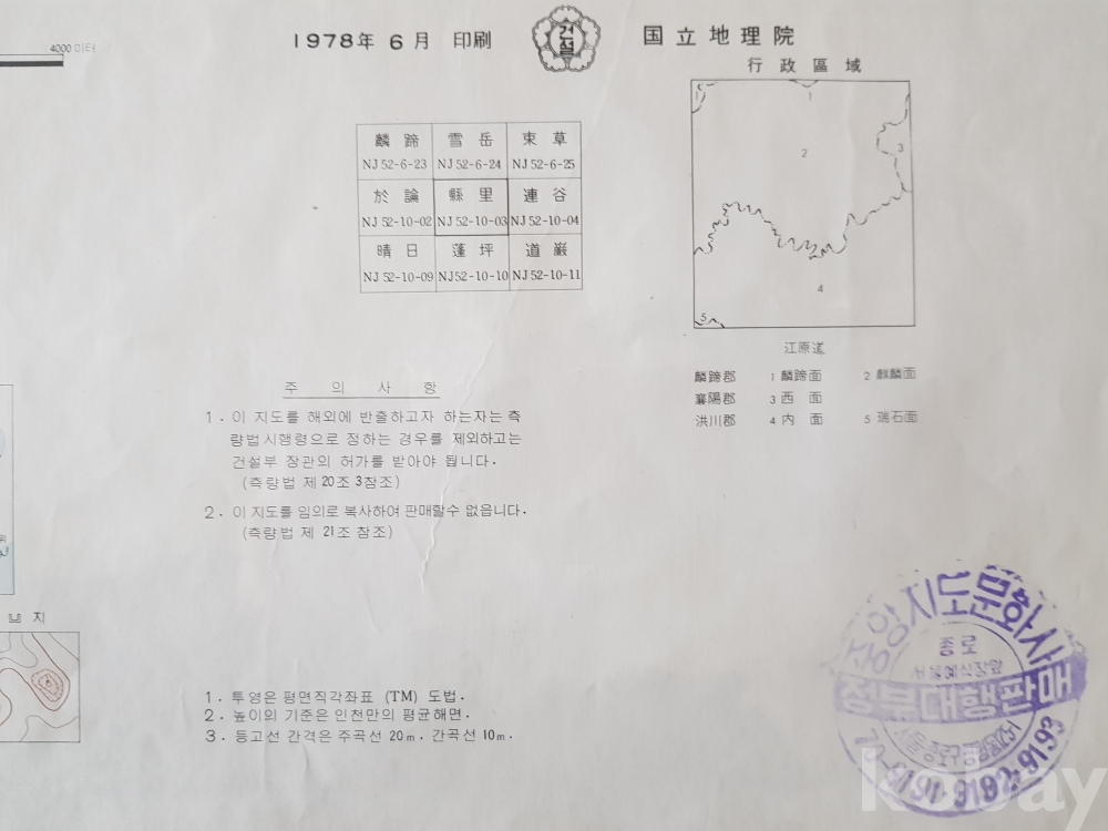 1974년 1:50,000 지도 (현리) 인제군, 양양군, 홍천군 수록
