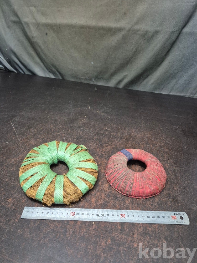 전통 또아리 2점 짚으로 만든 또아리 와 손바느질로 만든 짚에 천으로 꼬매어 만든 또아리 1점 일괄 13*13*4