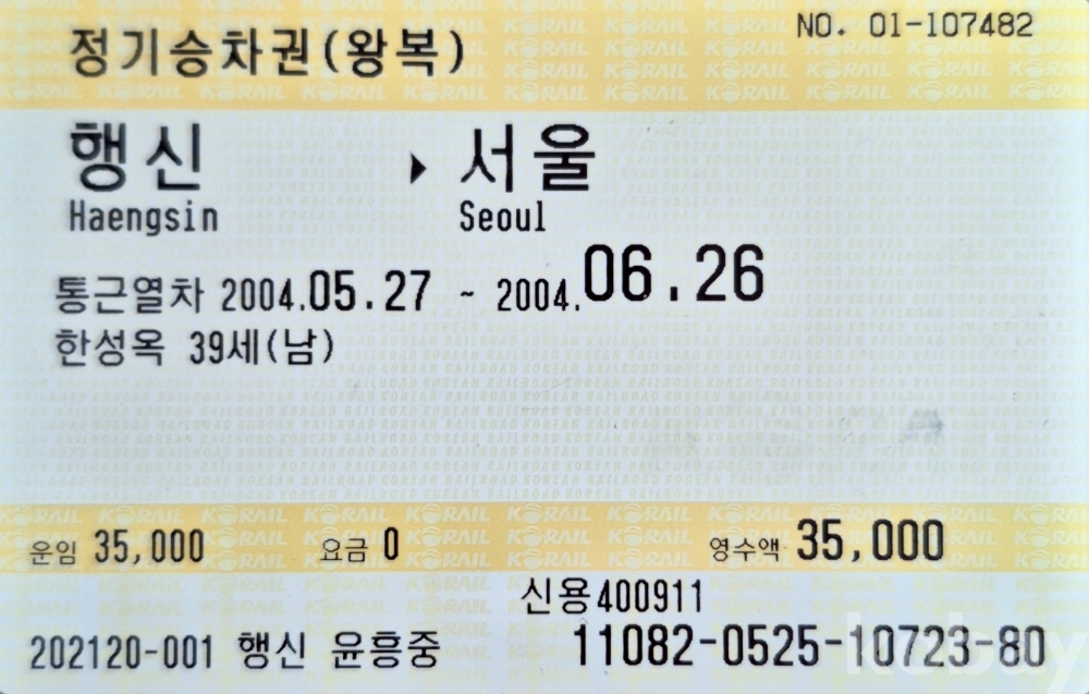 현재는 전철이 다니는 경의선 구간의 2004. 5. 25. 발행 행신-서울 통근열차 정기승차권입니다.