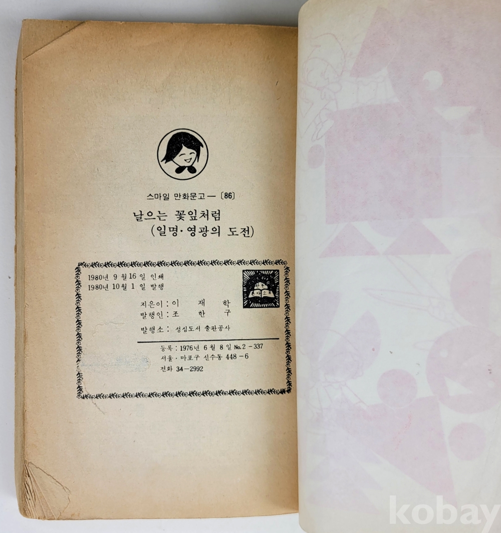 물 품 명 | [스마일만화문고86] 이재학 / 날으는 꽃잎처럼(일명:영광의 도전) / 1980년 초판본 / 성심도서출판공사 |