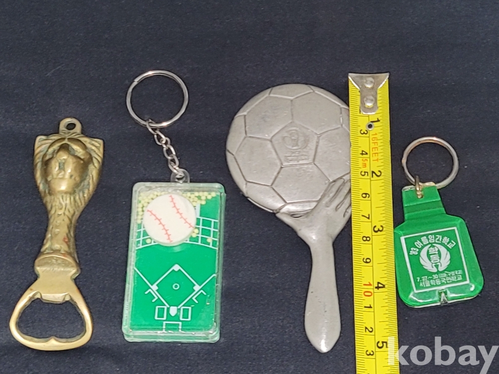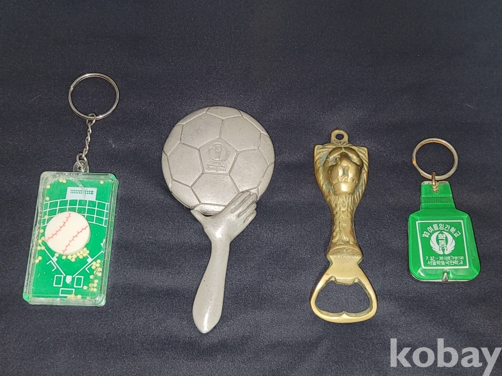 빈티지 세월 감이 느껴지는 1983년 열쇠고리 병따개, 2002년 한일월드컵 주석 손거울, 야구장 열쇠고리, 사자 병따개 등 4종 일괄입니다.