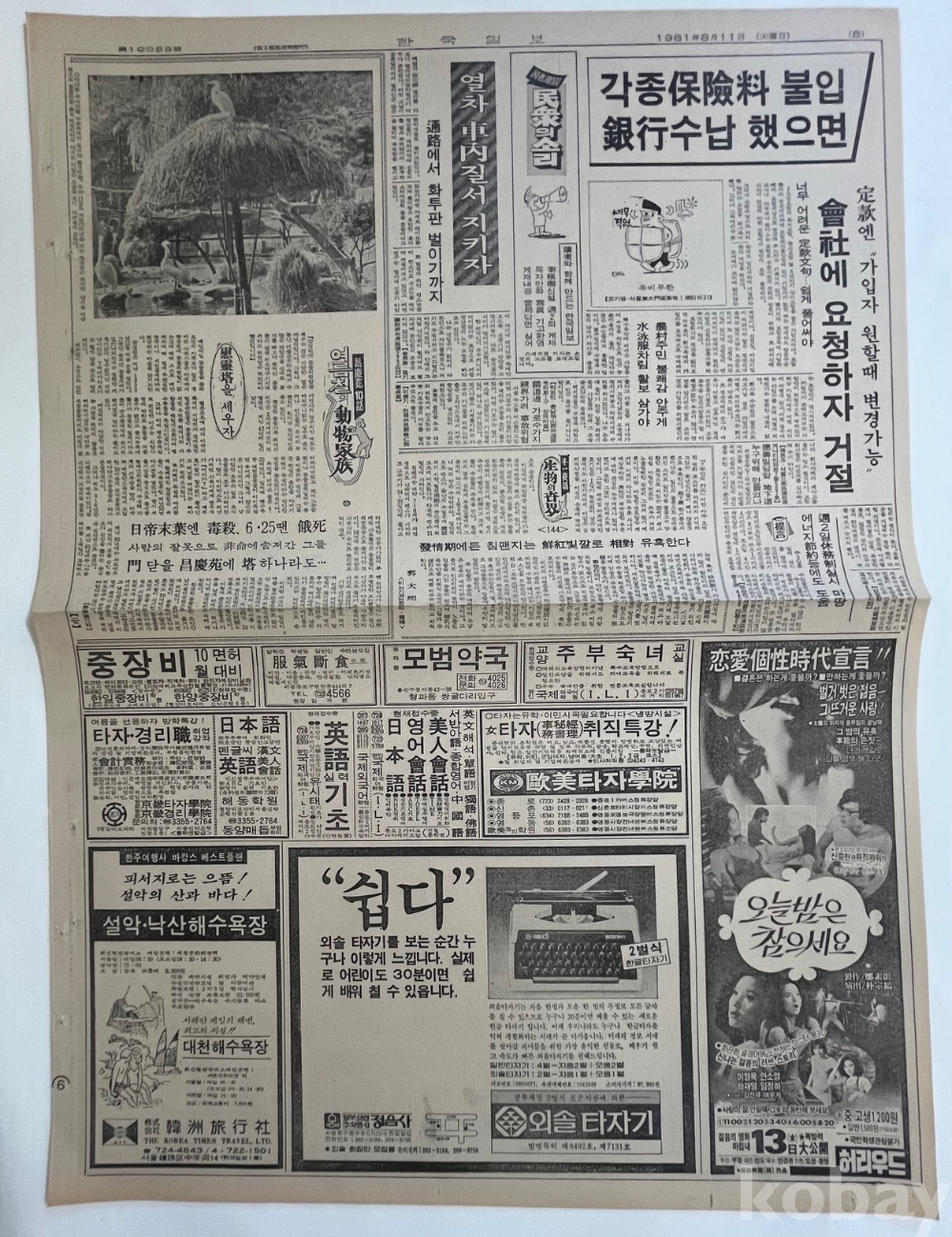 영화광고, 여행사, 타자기 광고가 실린 1982년 한국일보 낱장입니다.