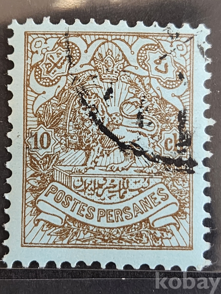 하늘색 용지에 갈색으로 인쇄된 2도판(이색 인쇄)으로, 당시 페르시아 우정국에서 발행한 정식 'POSTES PERSANES' 시리즈 중 하나입니다.