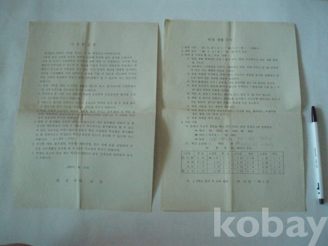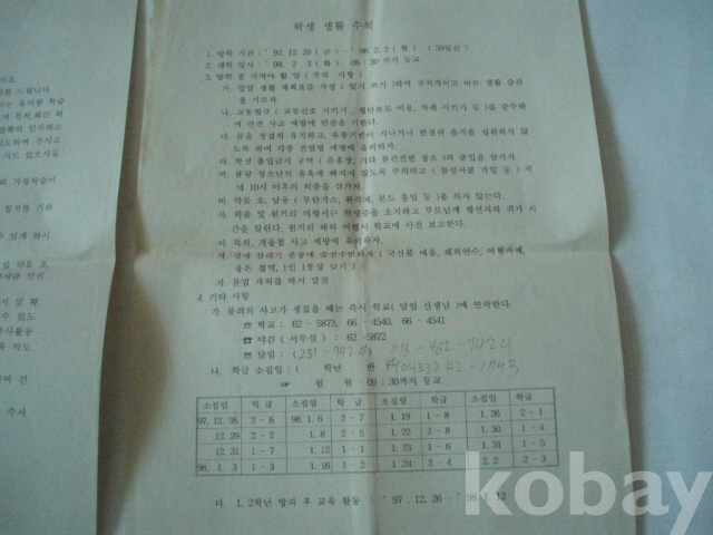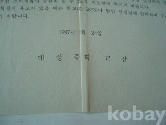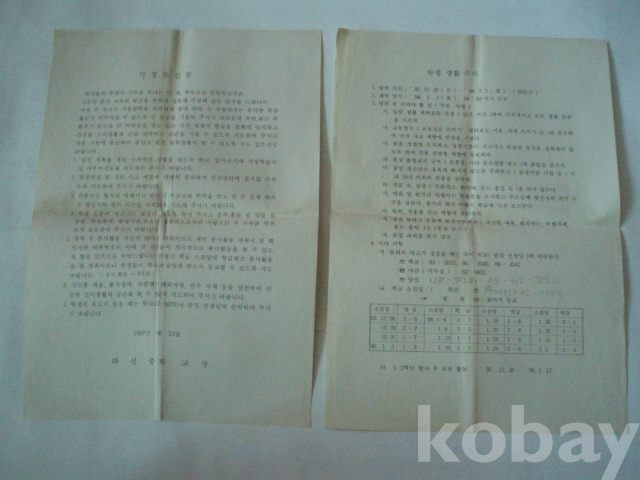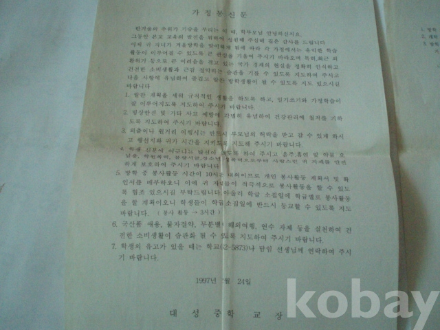 겨울방학에 따른 - 가정통신문 및 학생 생활 수칙 (1997년, 대성중학교)