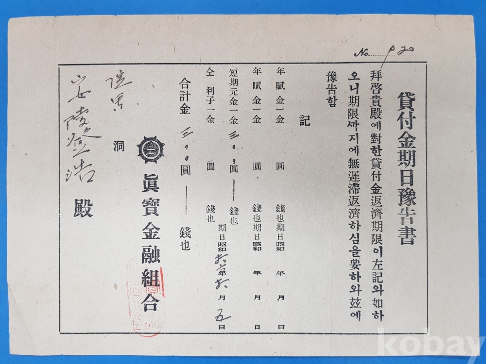 **** 일제강점기 진보금융조합 대부금기일예고서(창씨개명한 이름)