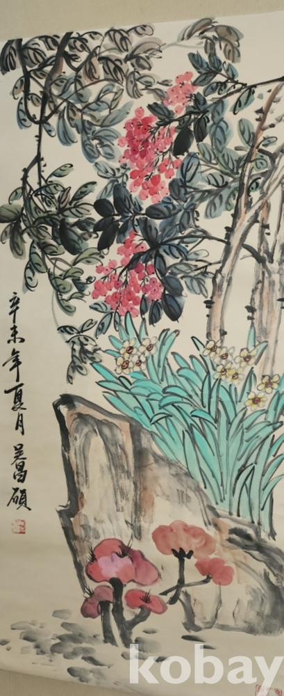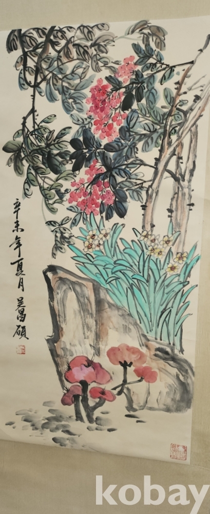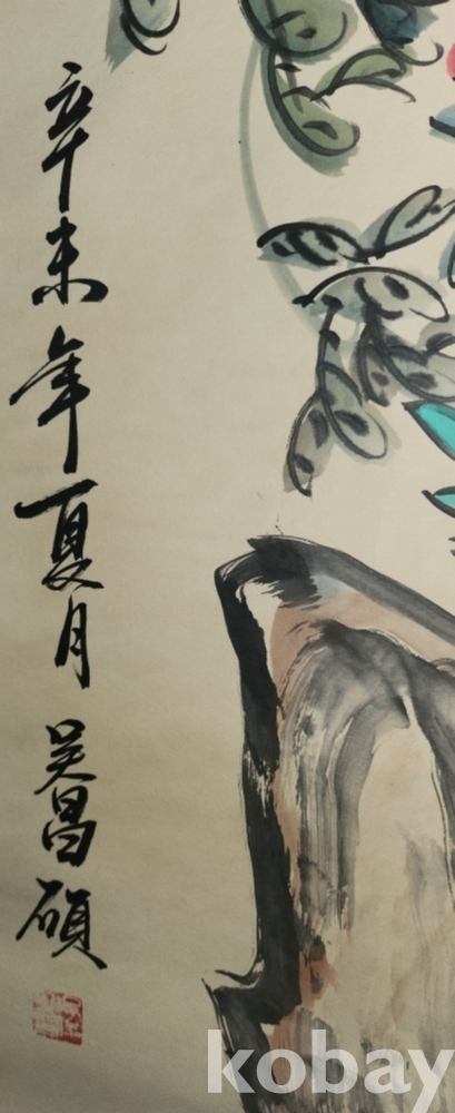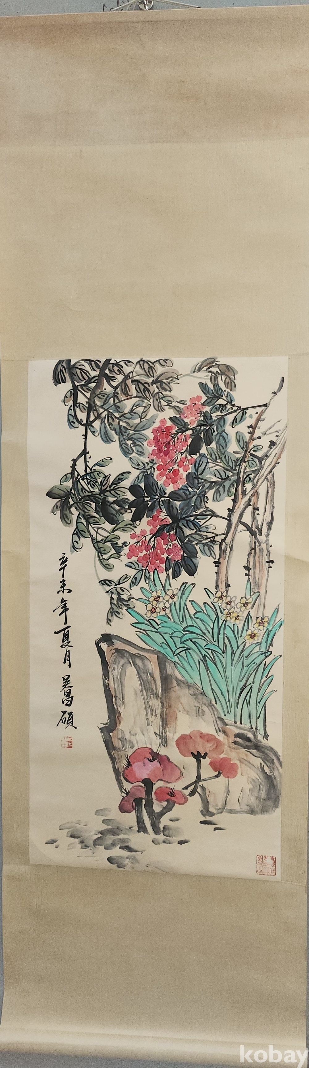 청나라 화가 오창석(吳昌碩) 作 종이 에 채색한 꽃그림 족자입니다,