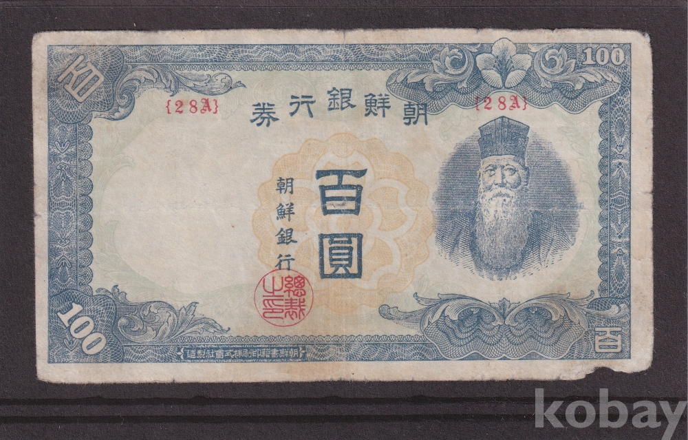 - 조선은행 1947년 무백원 판번호 28A 사용제 지폐