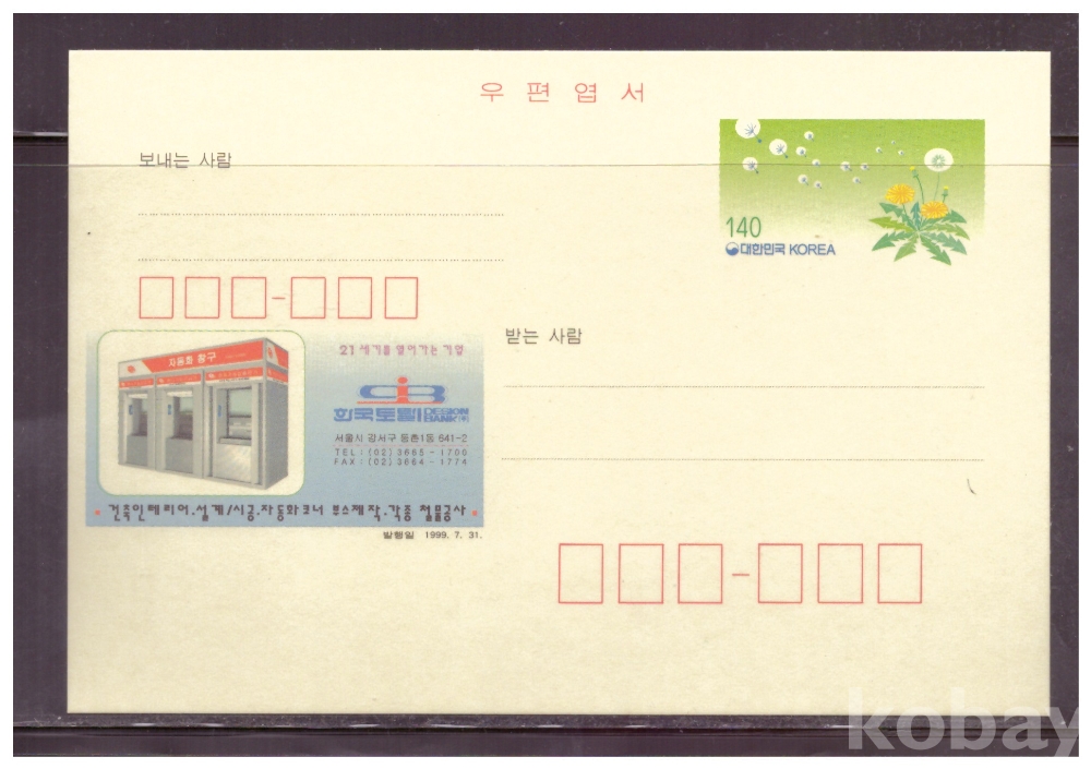 (광고엽서) 1999.7.31 지방판 LAPC357 한국토탈디자인뱅크(민들레 140원)