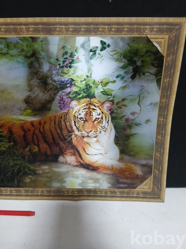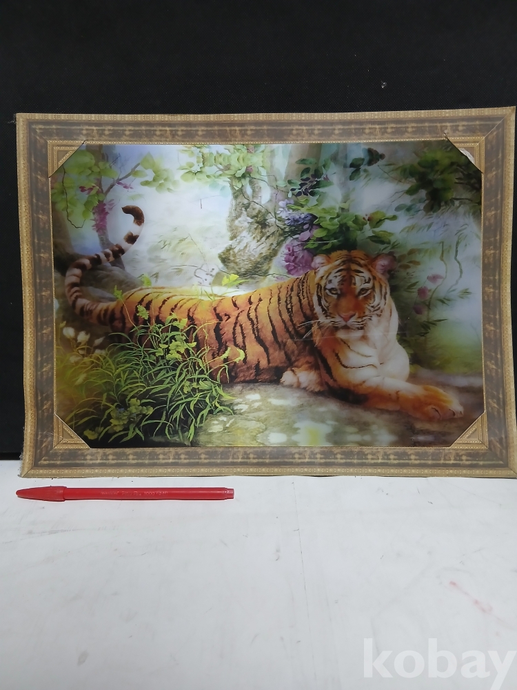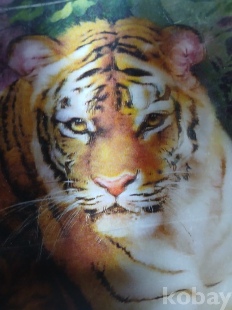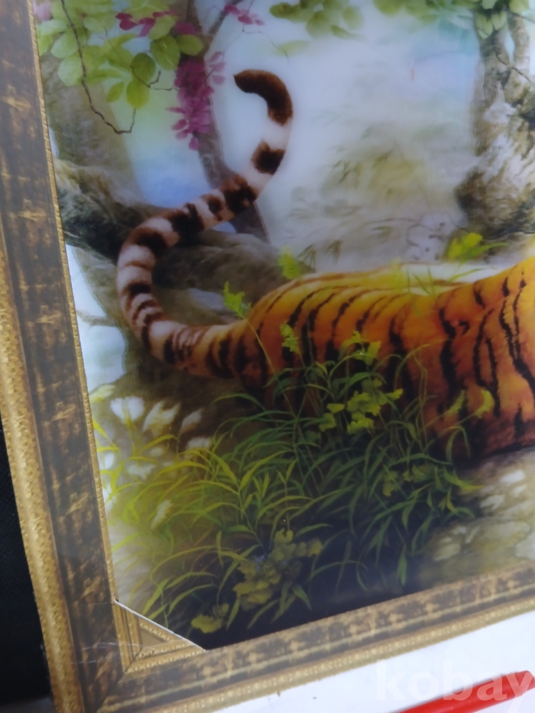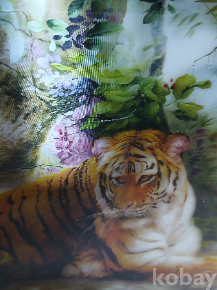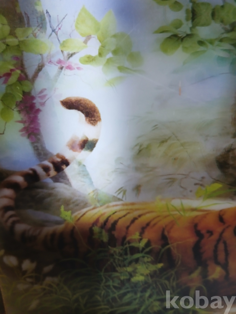 (사진으로 보면 입체감이 못느껴지지만 실제 육안으로 보면 숲속에 웅크리고 정면을 응시하고 있는 호랑이가 주변 환경과 구별되어 입체적으로 보임)