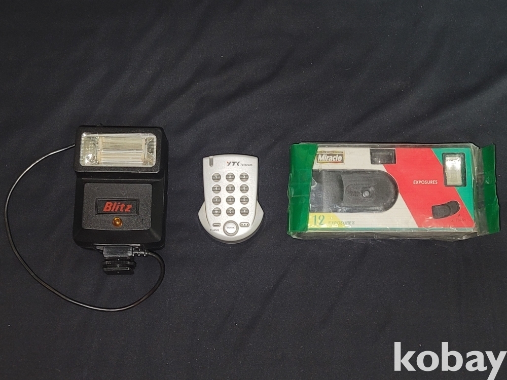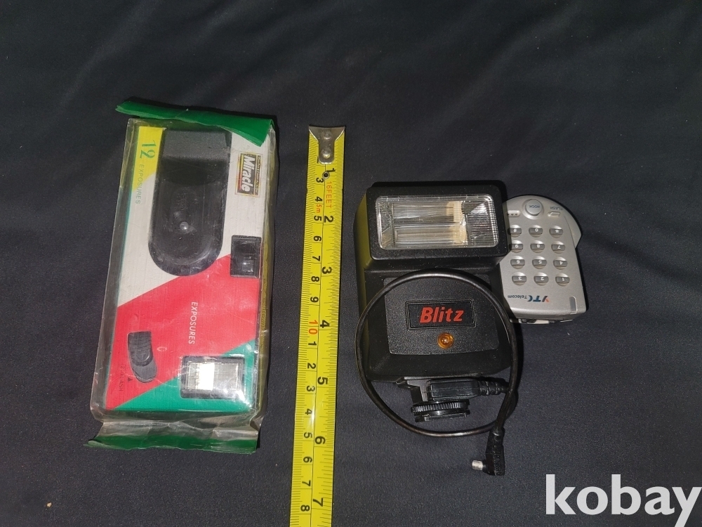 빈티지 레트로 Blitz 카메라 플래시, YTC텔레콤 마이폰 사오정전화기 YT8100, 미개봉 미라클 일회용 카메라 등 3종 일괄입니다.