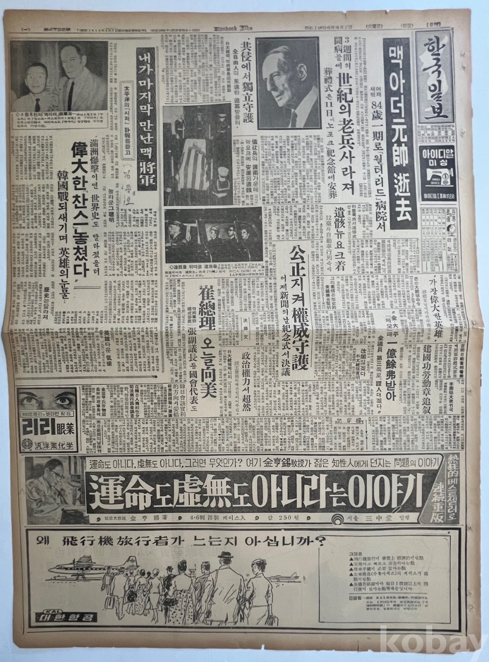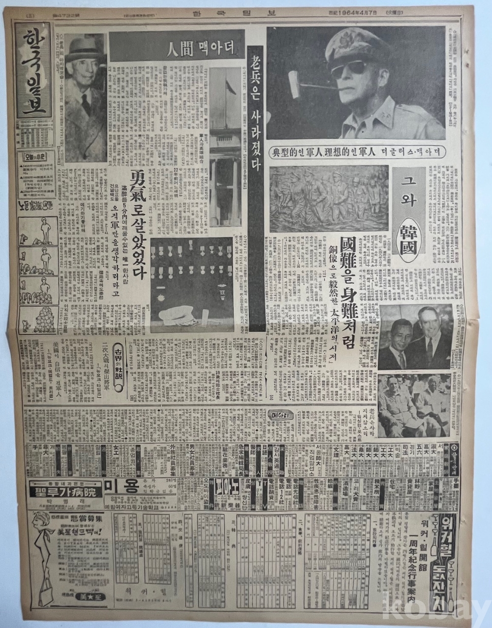 맥아더 장군 서거 관련 기사가 실린 한국일보 낱장 4장 입니다.