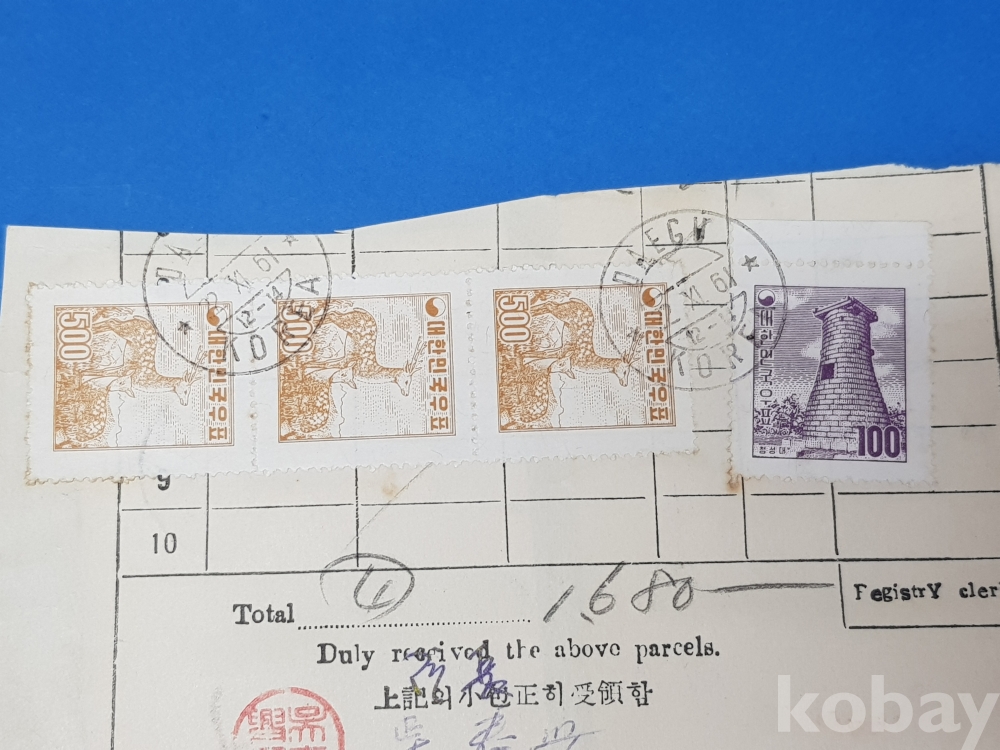 **** 1961년 우정투문보통 500환 사슴 3매, 100환 첨성대, 유네스코15년 s/s 2매 첩부 우편요금수령증원부