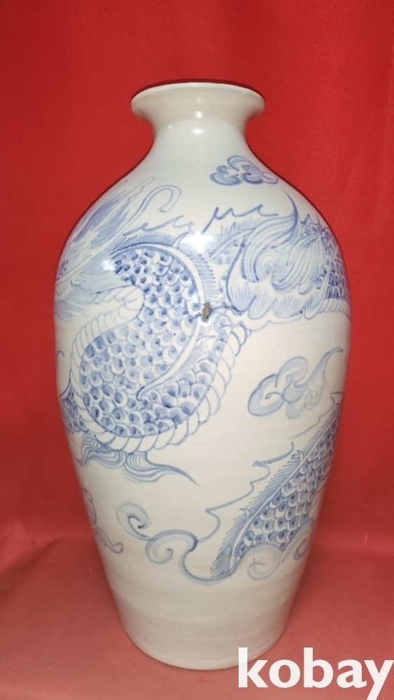 구한말 연대 갖춘 도예가 元堂 作 청화백자 운용(雲龍) 메기 문양 큰大作 기물입니다,