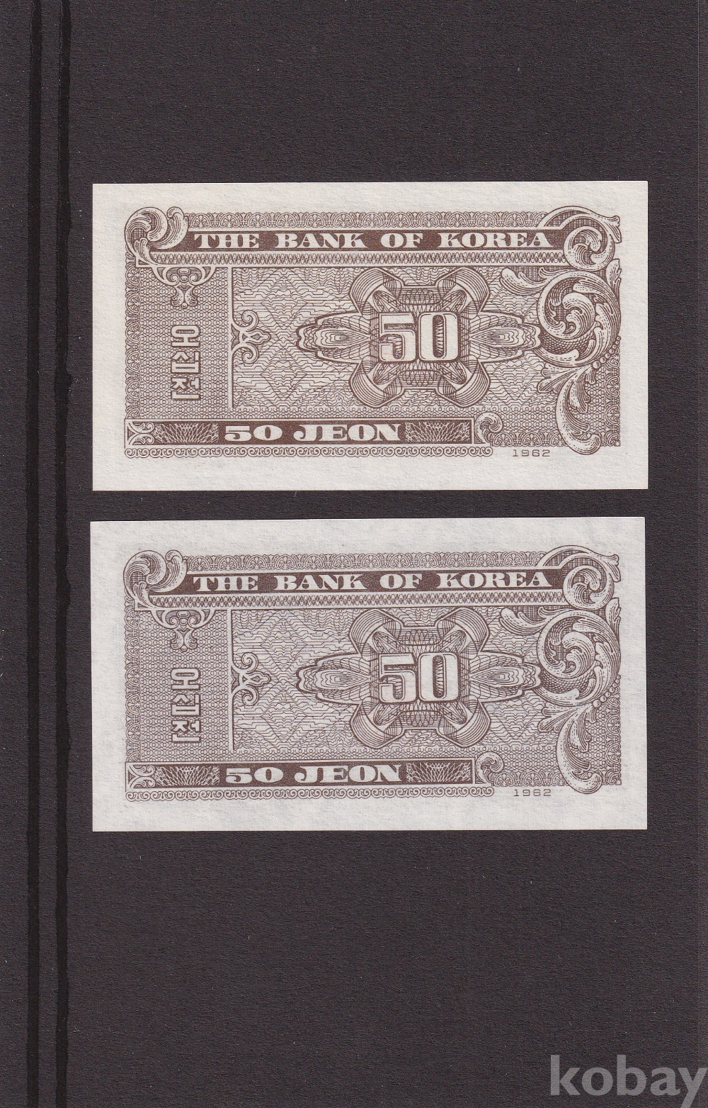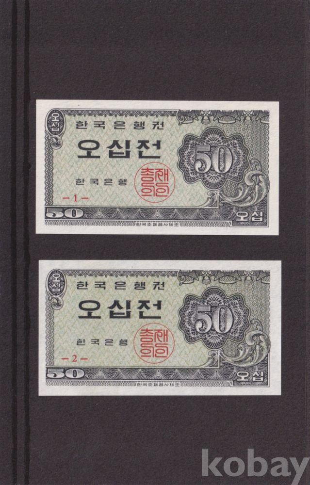 - 한국은행 1962년 소액 오십전 판번호 1번 / 2번 미사용 지폐 - 2장 일괄