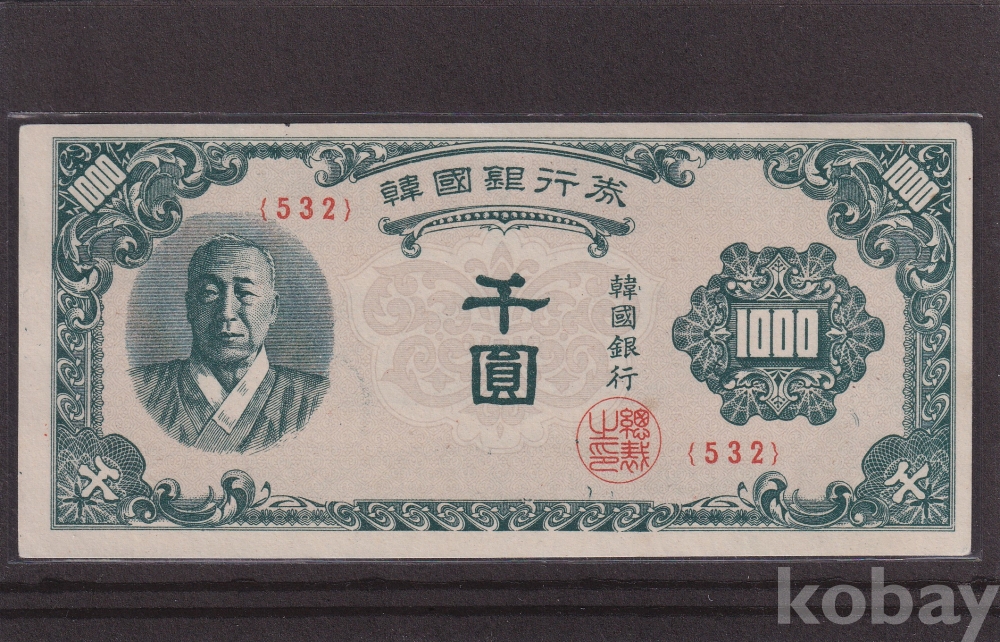 - 한국은행 1950년 최초의 1,000원권인 이승만 한복 천원 한국인쇄 판번호 532번 지폐 입니다.