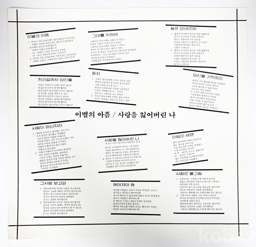 상품 설명 | Side A 1. 이별의 아픔 2. 천리길에서 당신을 3. 사랑이 떠난 자리 4. 그사람 보고파 5. 그대를 위하여 6. 둥지 Side B 1. 사랑을 잃어버린 나 2. 헤어져야 해 3. 슬픈 미네로바 4. 당신을 기억하리 5. 이밤이 새면 6. 사랑은 물그림 7. 건전가요 | ||