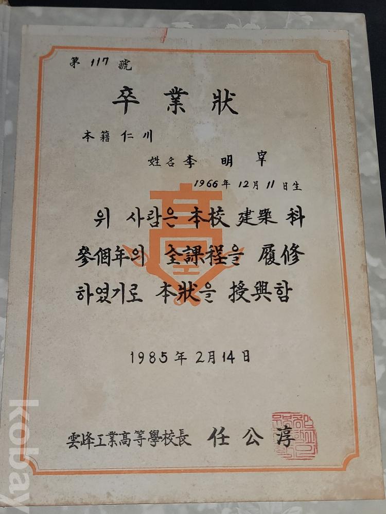 빈티지 세월 감이 느껴지는 운봉공업고등학교(雲峰工業高等學校)의 1984학년도 제11회 졸업 기념 앨범과 졸업장 일괄입니다.