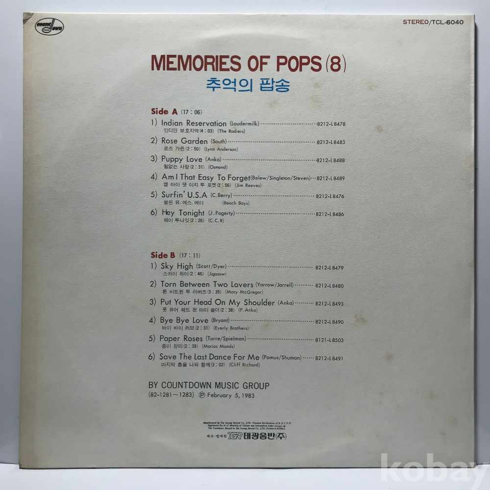 LP 82,350-41 MEMORIES OF POPS(8) ORIGINAL ARTISTS . 자켓 EX+ 알판 EX+ 83 년제작 국내반