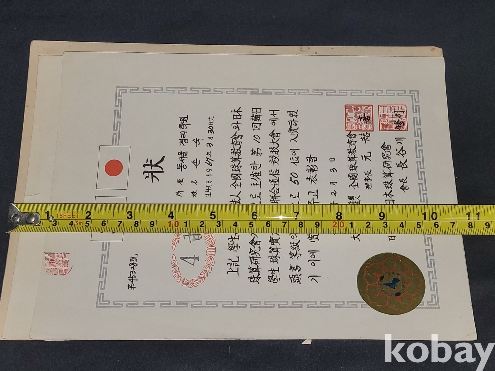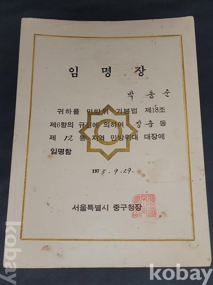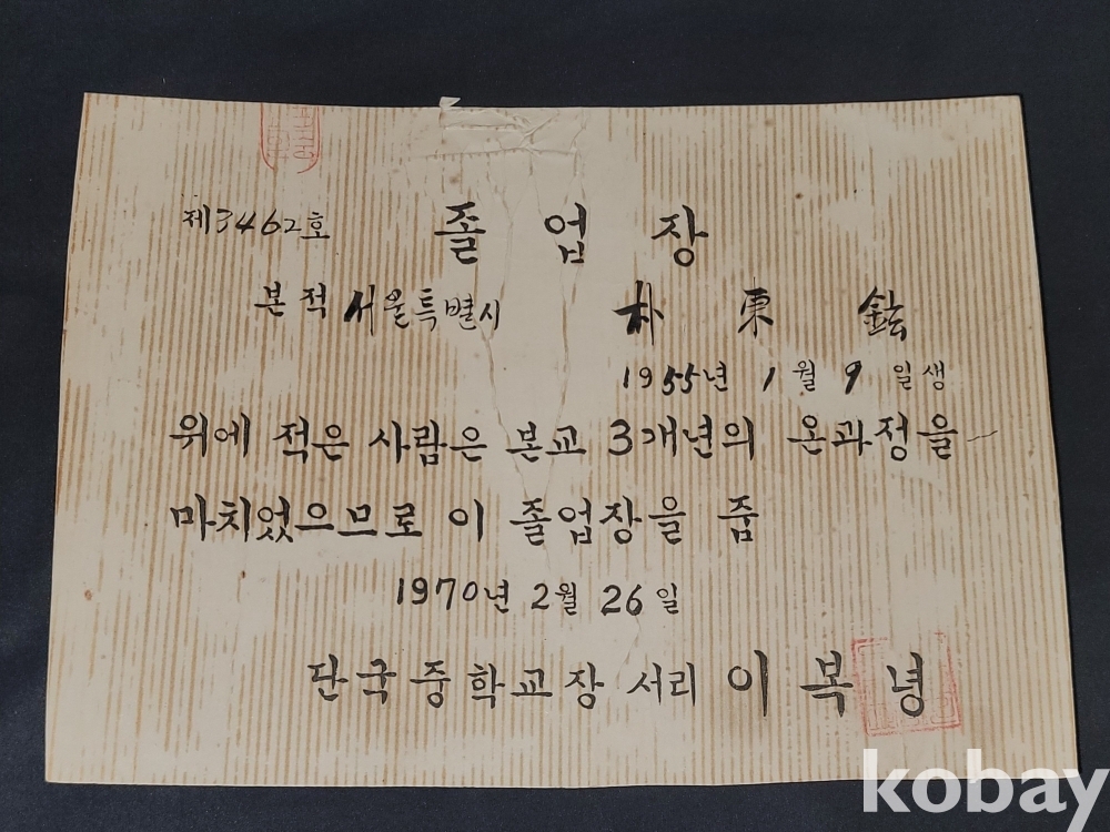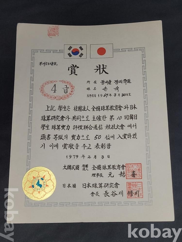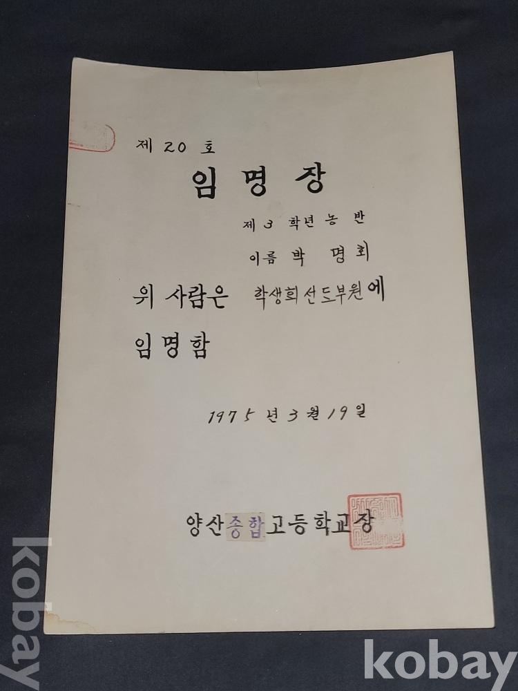 빈티지 세월 감이 느껴지는 1970년 단국중학교 졸업장, 1975년 민방위대 대장 임명장, 1975년 양산종합고등학교 선도부 임명장, 1979년 주산 관련 상장