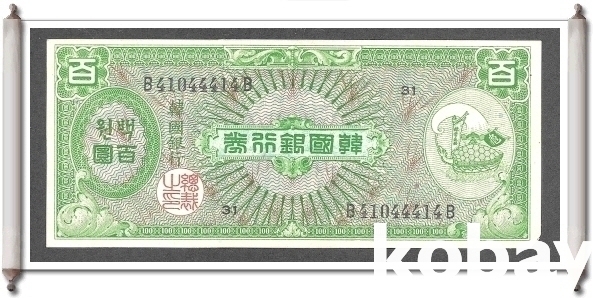 미국에서 제조한 한국은행 거북선 100원권 지폐입니다.