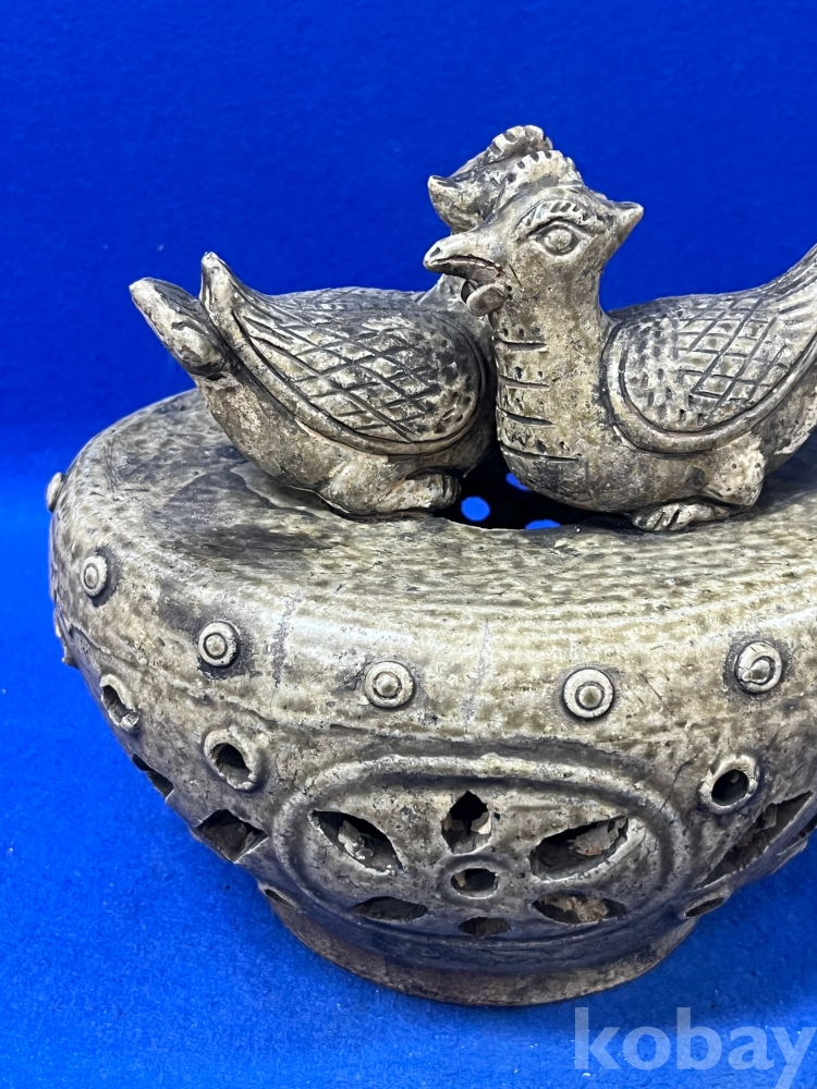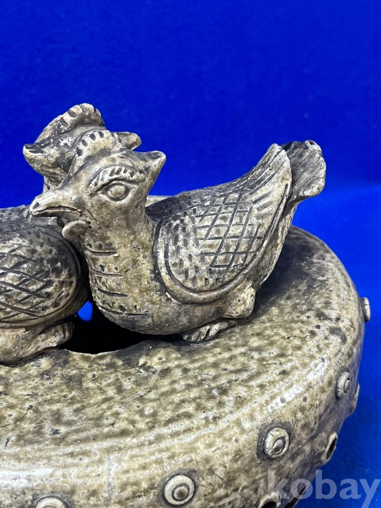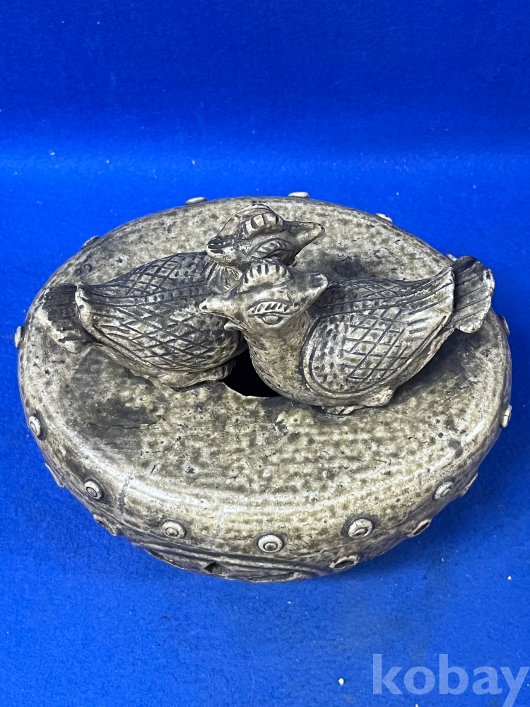 그 위에 두 마리 새가 마주보며 앉아 있는 형태의 뚜껑을 올린 독특한 조형의 작품입니다.
