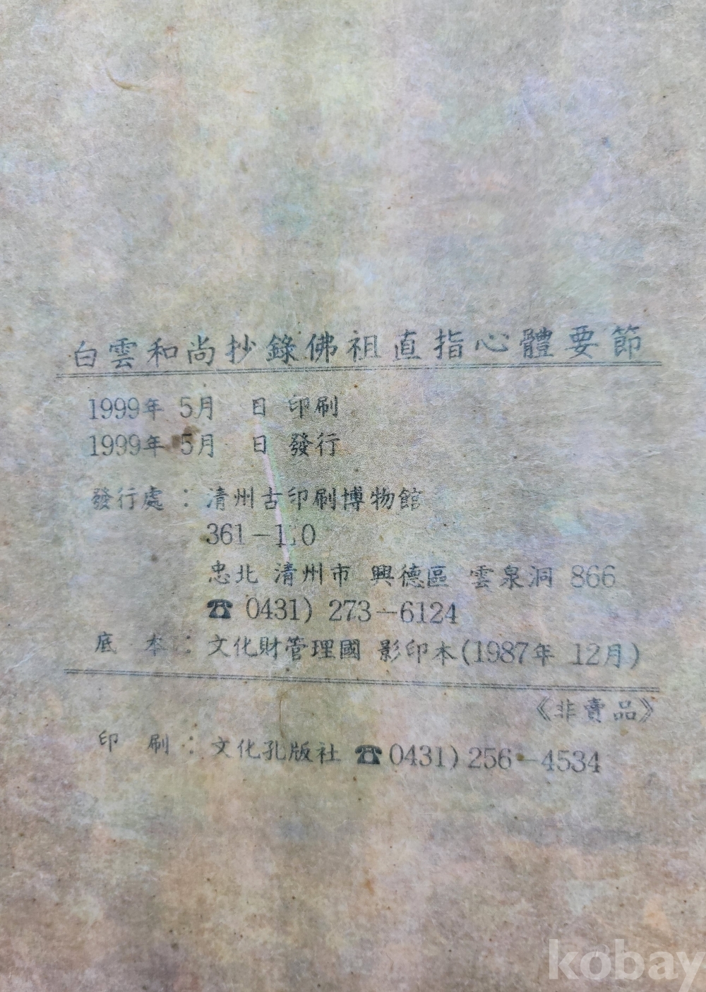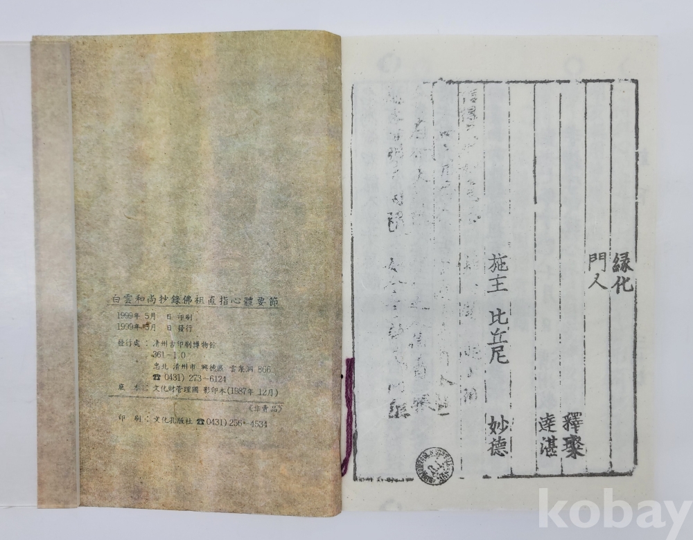 현재 프랑스 파리 국립도서관에 소장된 금속활자본 『직지』 하권은 1987년 2월 문화재관리국에서 영인(影印)한 바 있으며, 이 책은 1999년에 이를 다시 영인한 것이다.