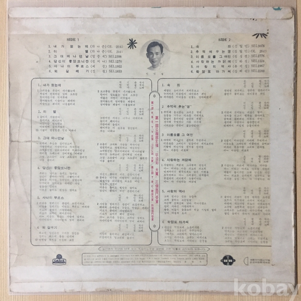 1. 내가 왔는데 (하나준) 2. 이별 (하나준) 3. 그대 떠나던 날 (엄중석) 4. 당신이 좋았으니깐 (진미나) 5. 사나이 부르스 (배성) 6. 외갈메기 (진철) | 1. 속죄 (김일민) 2. 추억에 우는 영 (김일민) 3. 이름 모를 그 여인 (진성진) 4. 사랑하는 까닭에 (김하정) 5. 사랑의 역사 (유지성) 6. 학암포 아가씨 (강혜란) |
