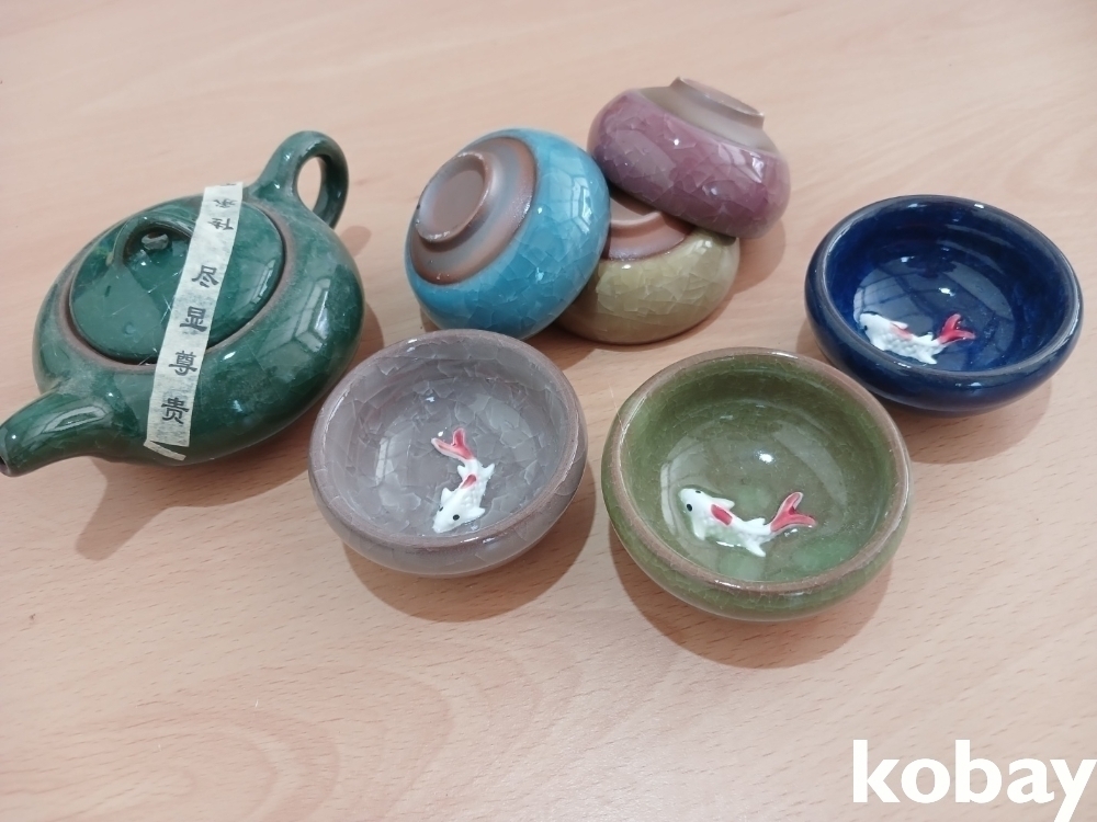 잔 속에 물고기가 입체감 있게 표현된 다기 셋트 입니다.
