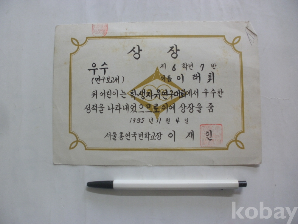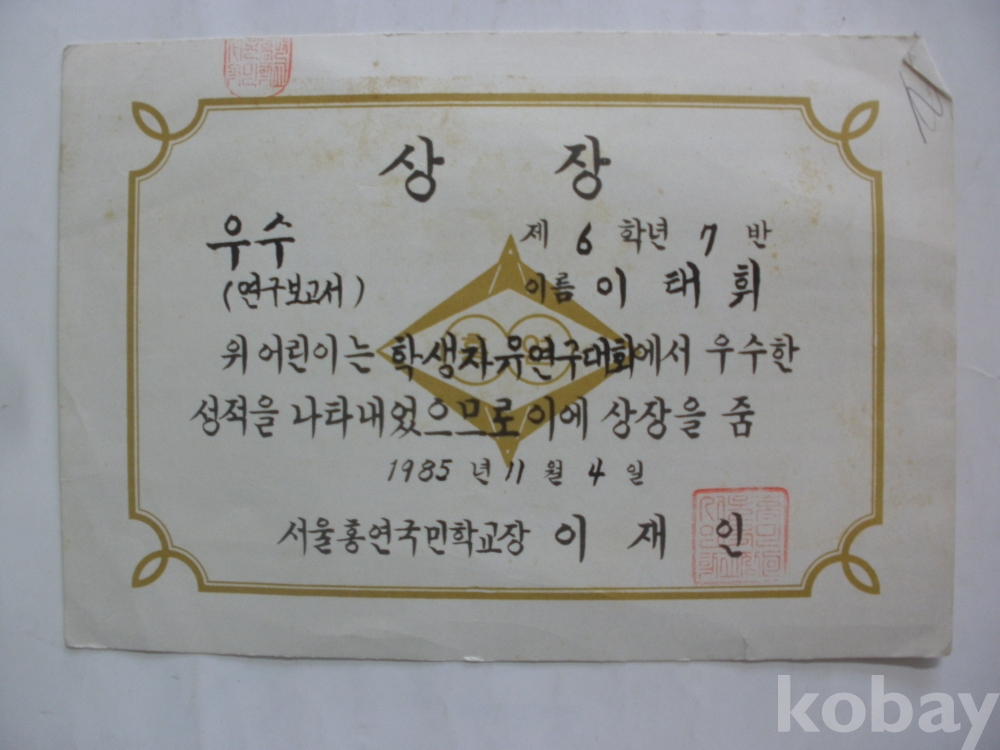 학생 자유연구대회 우수 상장 (1985년, 서울 홍연국민학교)