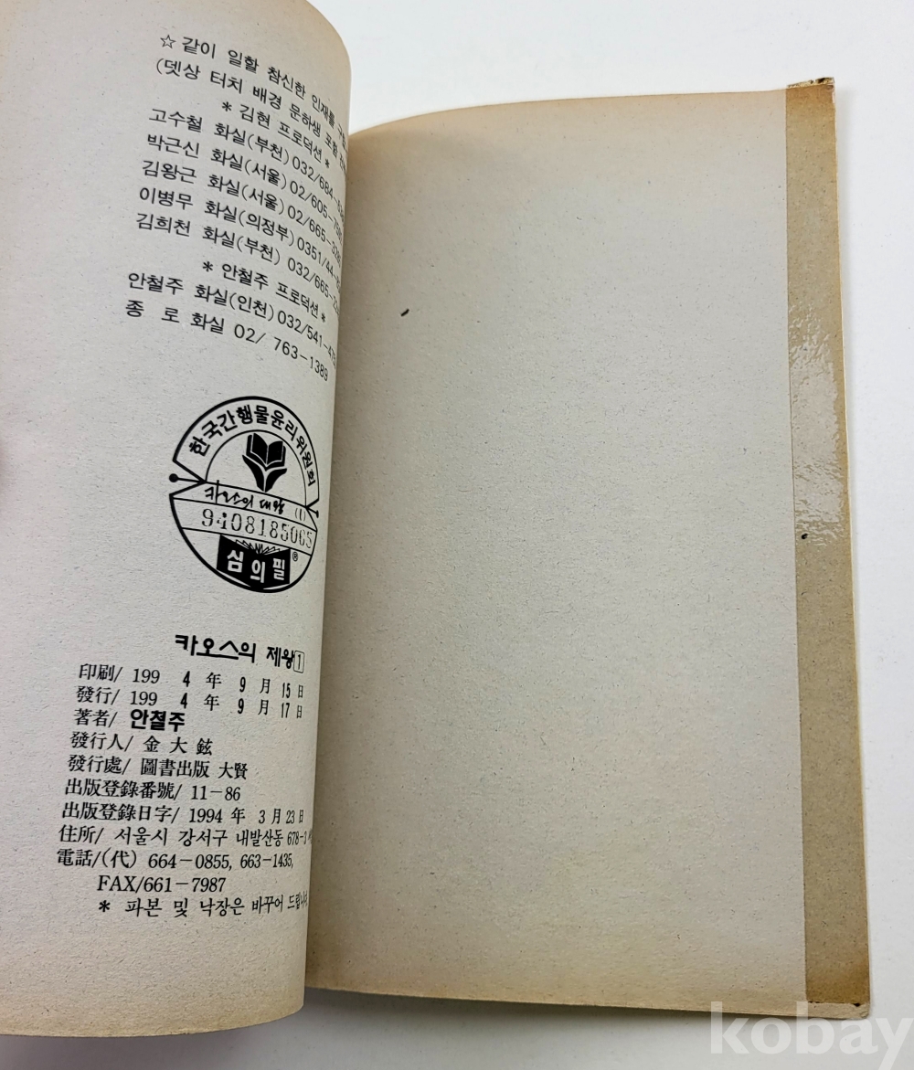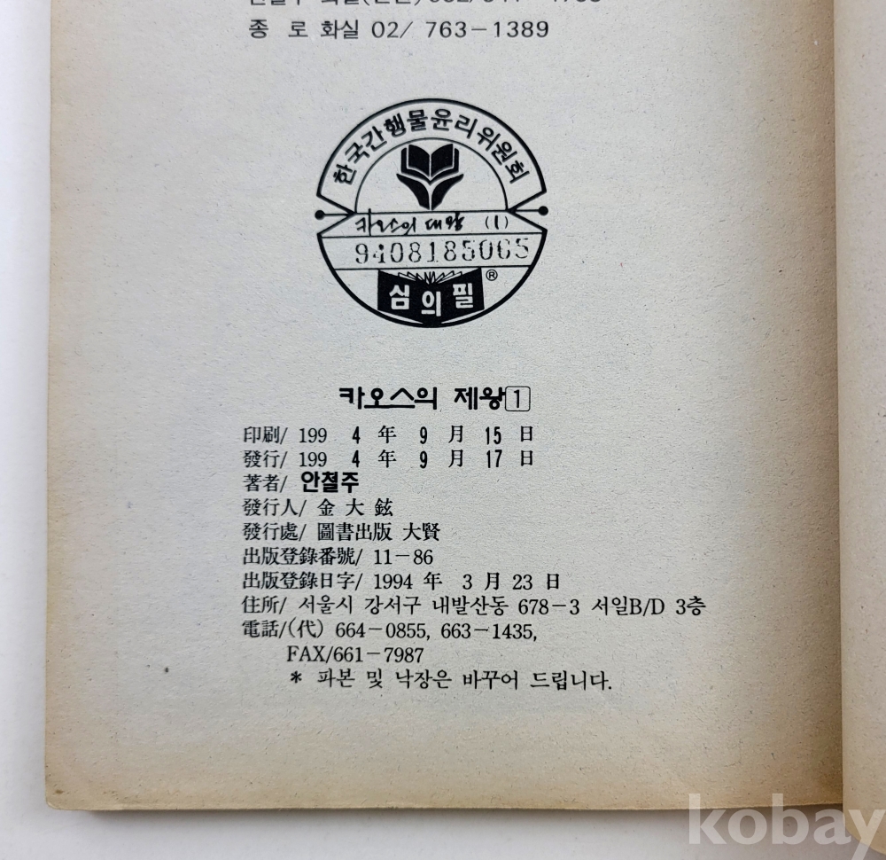 물 품 명 | 안철주 / 카오스의 제왕 (1~12)완결 총12권 / 1994년 초판 / 도서출판 대현 |