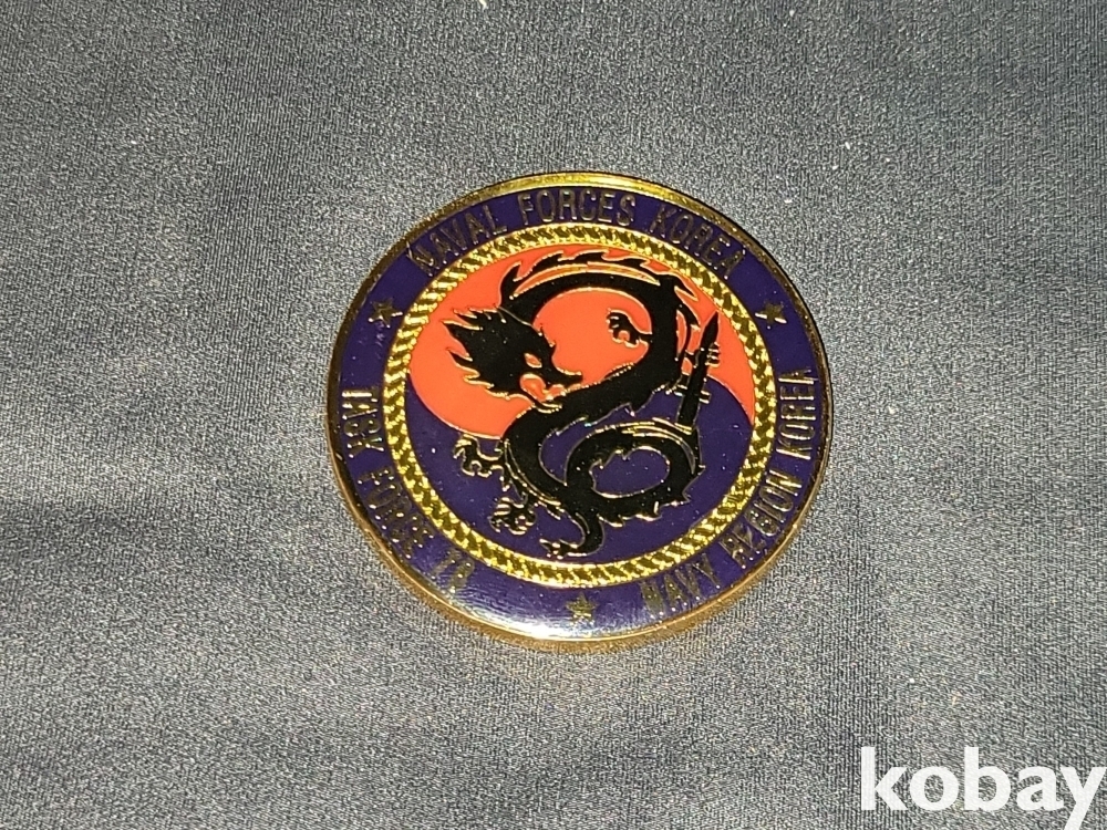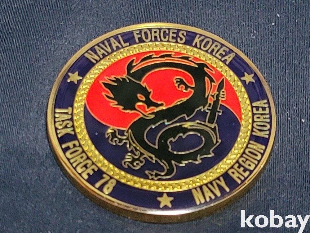 세 가지 사령부가 있는 태극 문양 위에 용이 그려져 있고, 뒷면에는 F-18, USS Ronald Reagan(CVN 76), ROKS Sejoeong the Great(DDG 991), 그리고 미국과 대한민국 국기 위에 비행사 장교 날개가 그려져 있습니다.