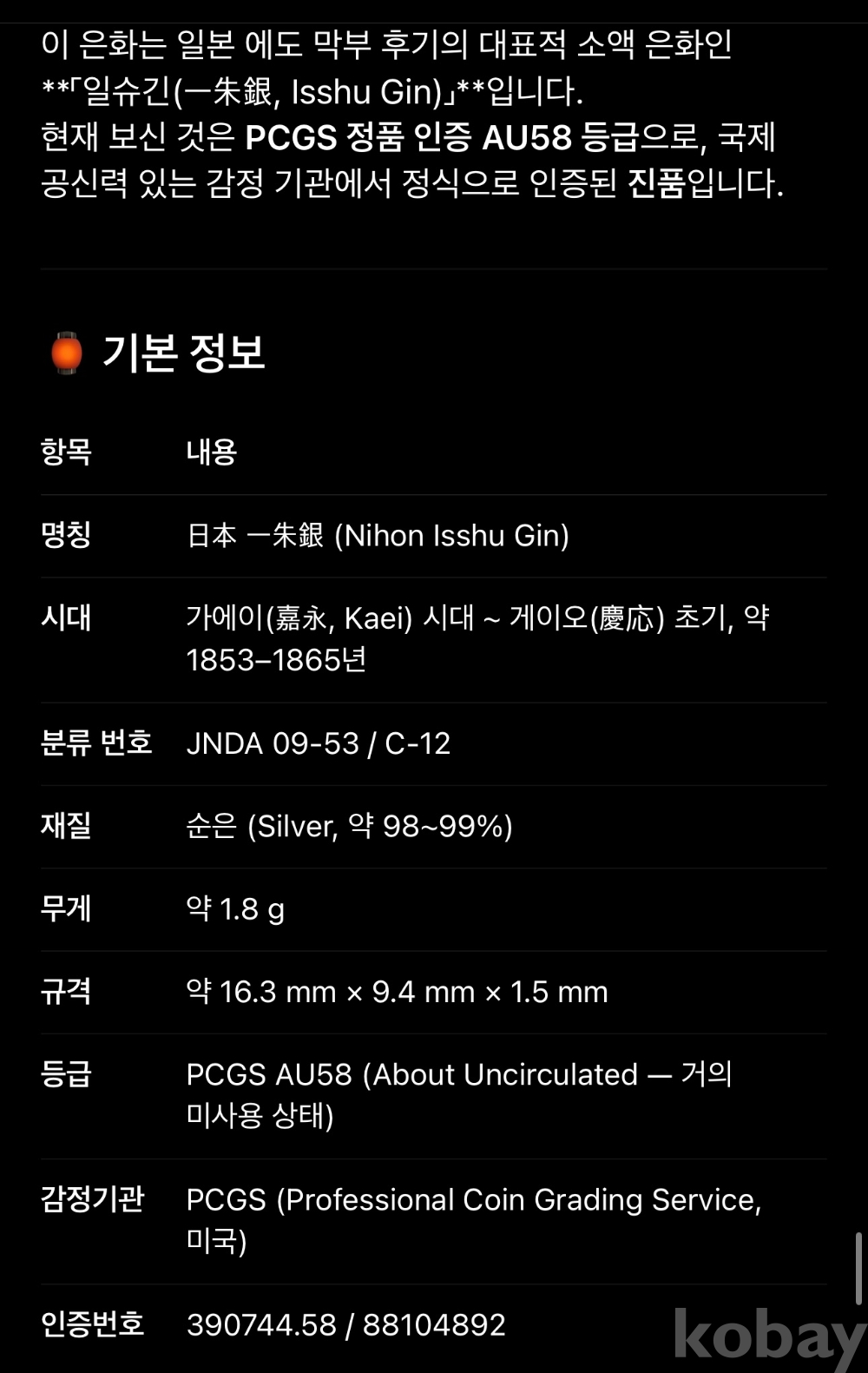 | 물품 크기 | PCGS |