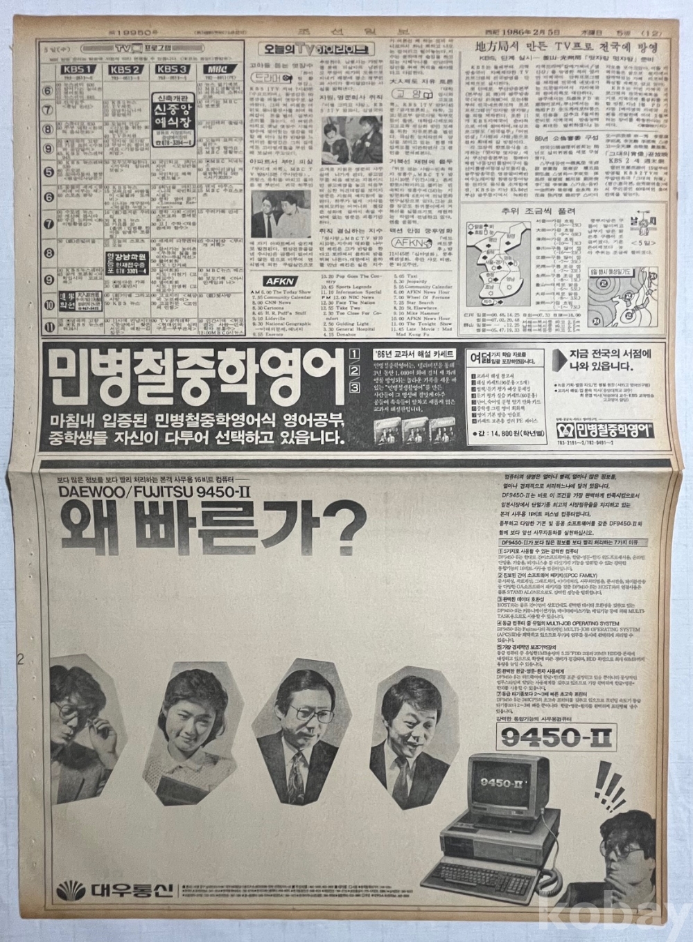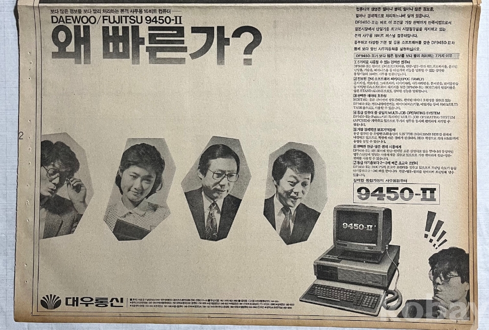 대우 사무용 컴퓨터 광고가 실린 1986년 조선일보 낱장입니다.