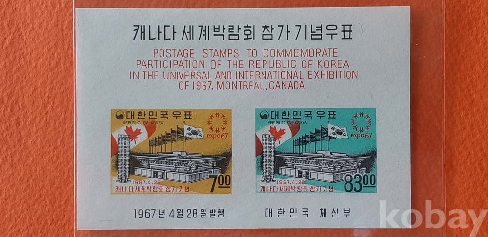 1967년 4월 28일 발행 캐나다 세계박람회 참가 기념 소형시트 입니다.